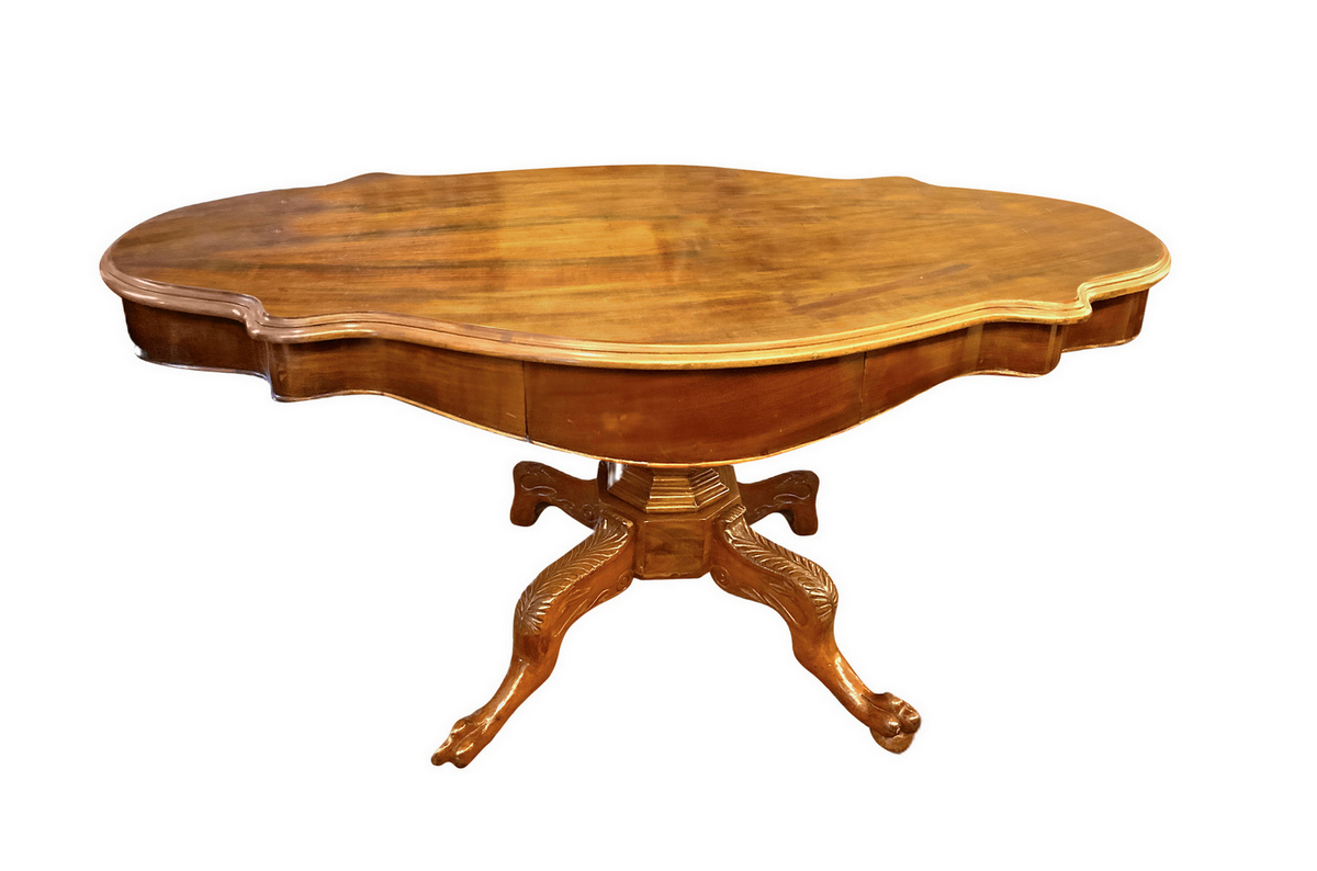 Tavolo a biscotto in legno di mogano con cassetti centrali ambo i lati, retto da una balaustra polilobata con piede a quattro razze. XIX secolo. H cm 77. Piano cm 138x88. Ottimo stato