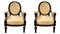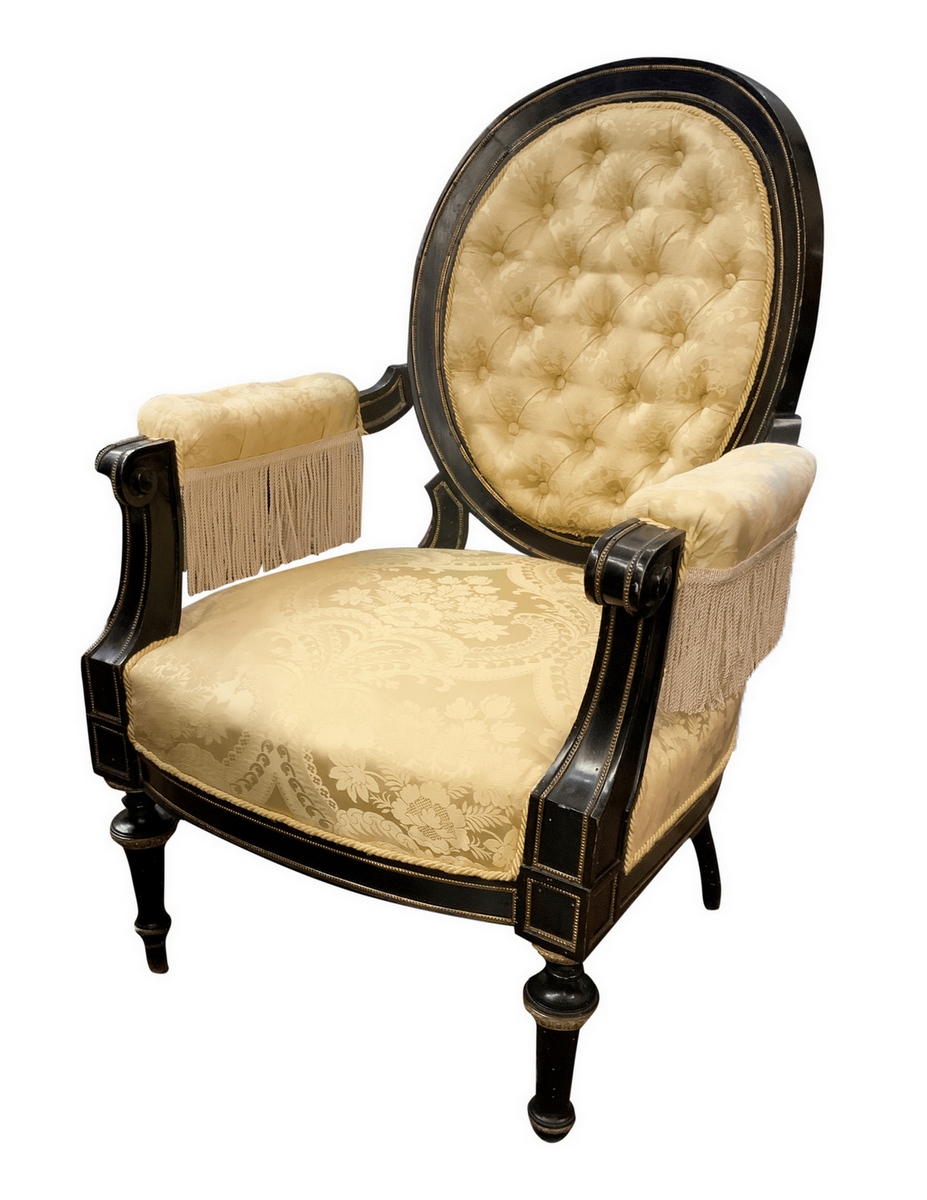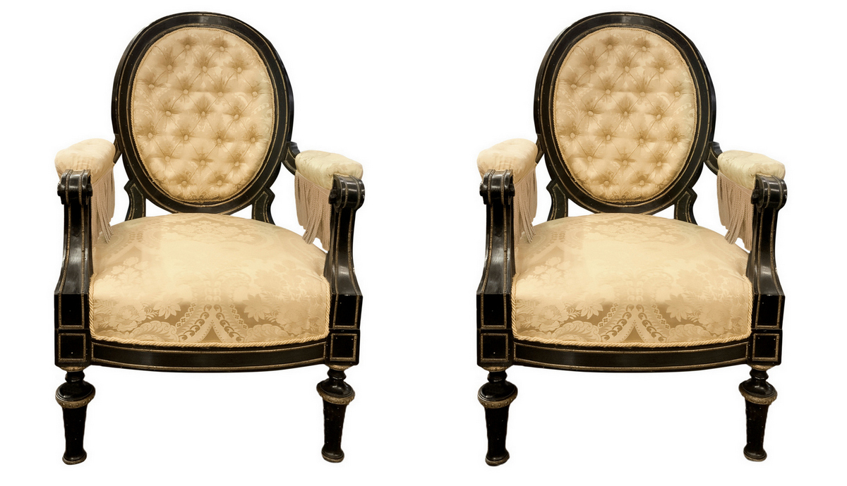 Coppia di poltrone in legno nero ebanizzato con spalliera ovale, bordure in ottone dorato, tappezzeria in damasco di seta con capitonnè alla spalliera, Napoleone III, fine XIX secolo. H spalliera cm 105. Seduta 60x60. Buone condizioni di stabilit&a