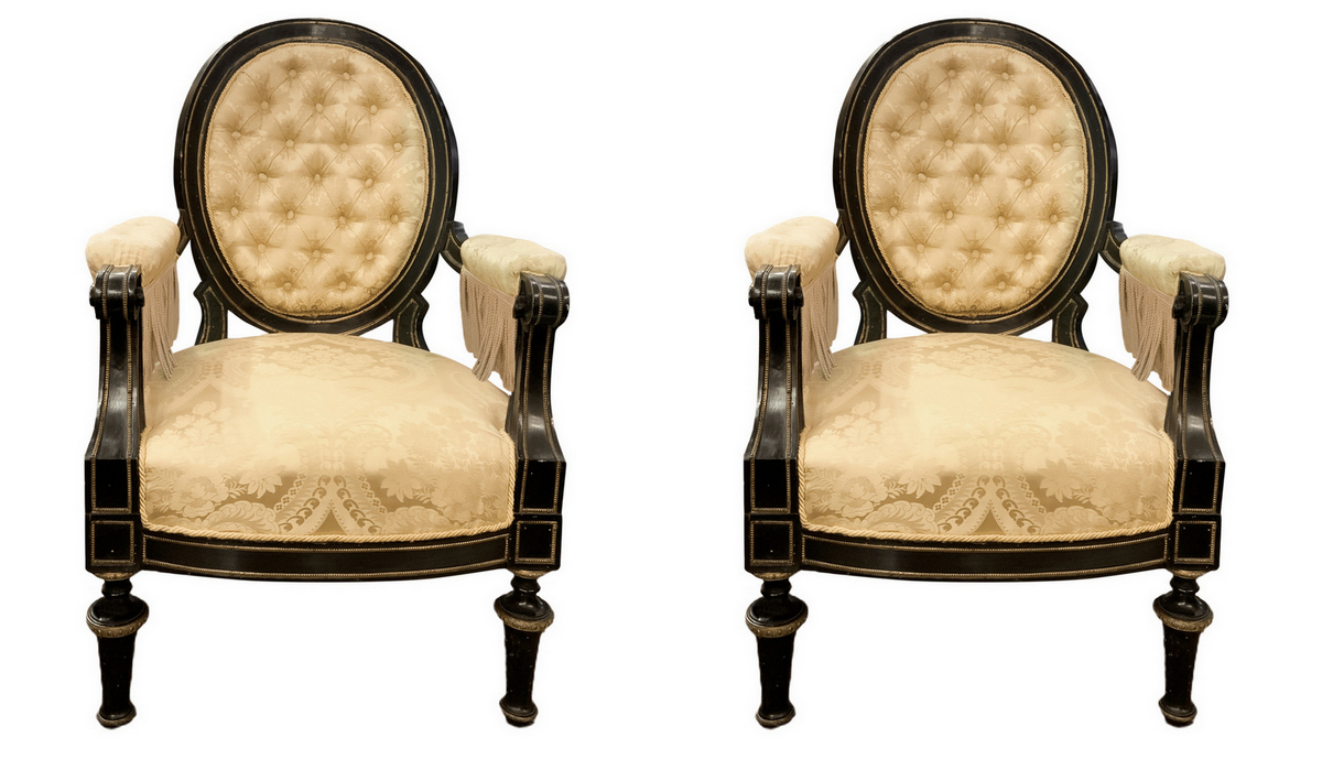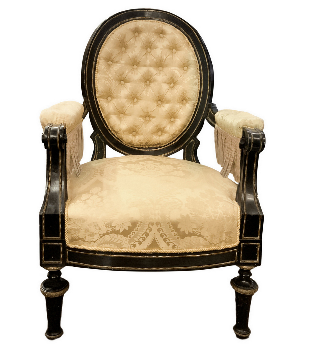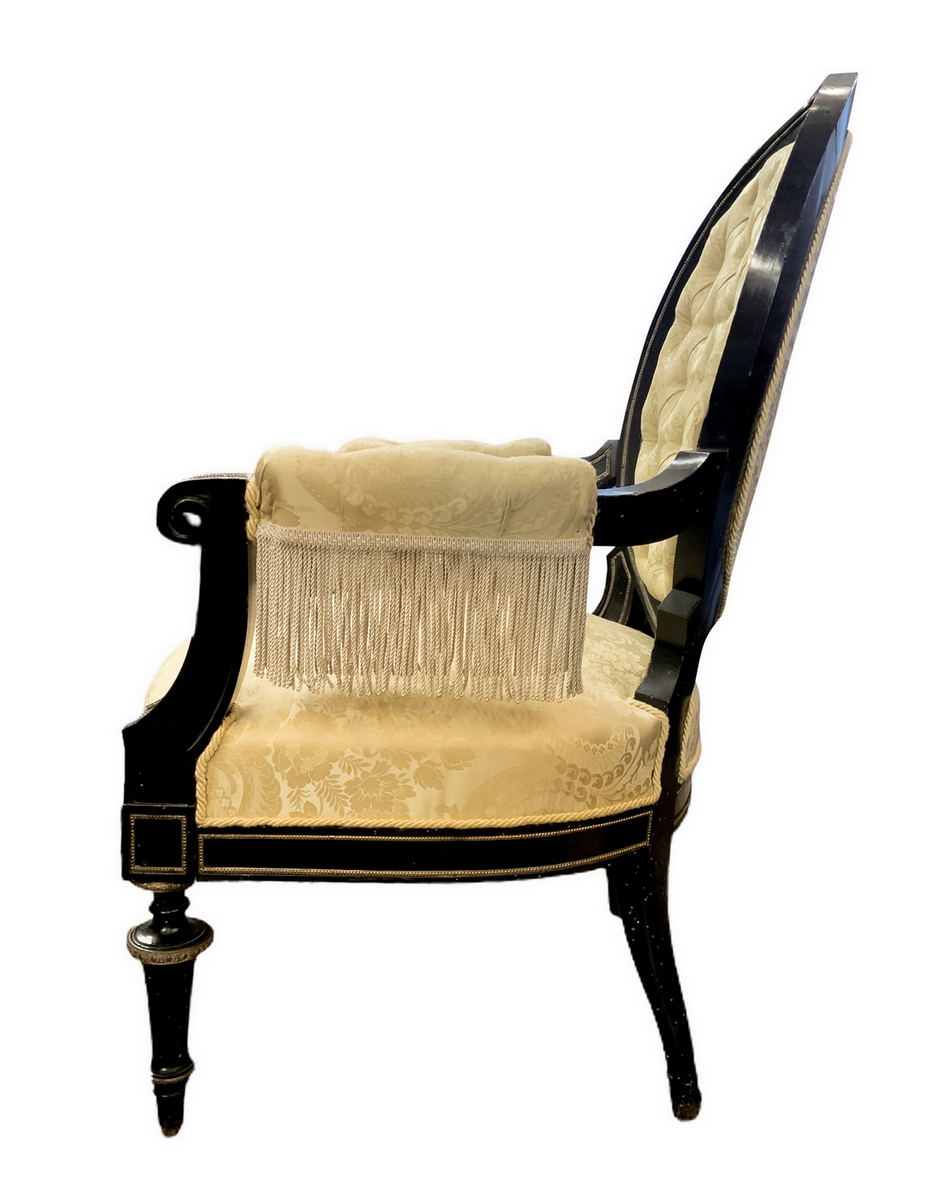 Coppia di poltrone in legno nero ebanizzato con spalliera ovale, bordure in ottone dorato, tappezzeria in damasco di seta con capitonnè alla spalliera, Napoleone III, fine XIX secolo. H spalliera cm 105. Seduta 60x60. Buone condizioni di stabilitÃ