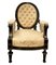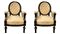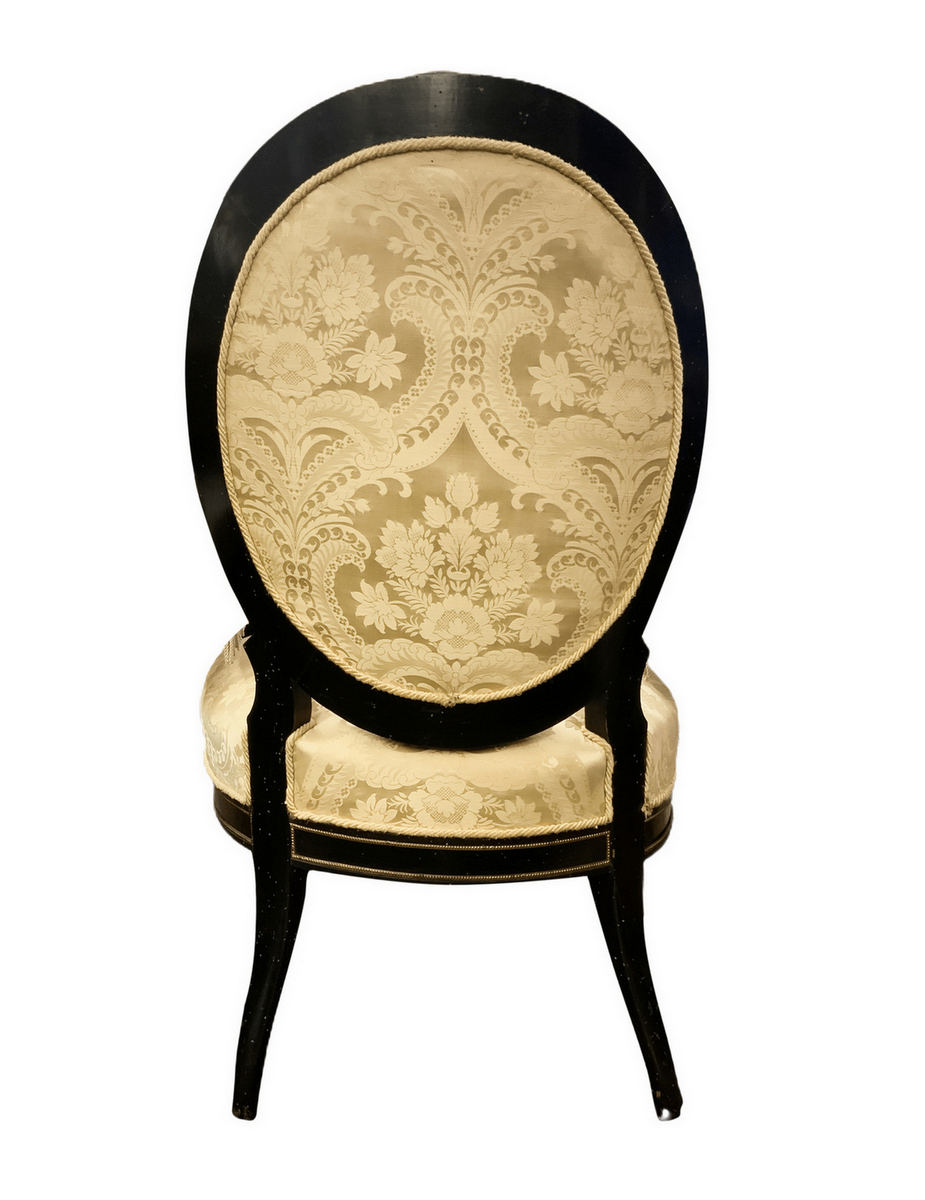 Lot 486 | Coppia di poltrone in legno nero ebanizzato con spalliera ovale, bordure in ottone dorato, tappezzeria in damasco di set