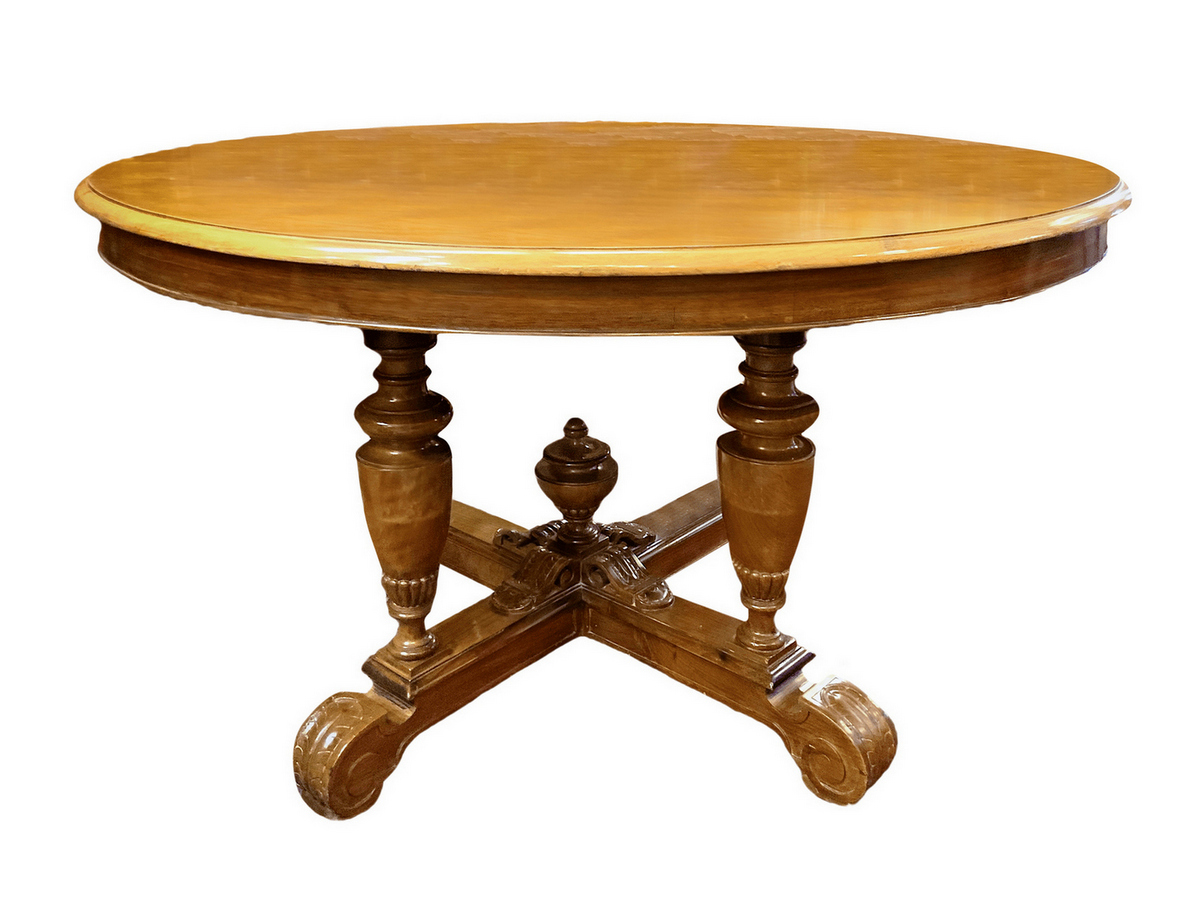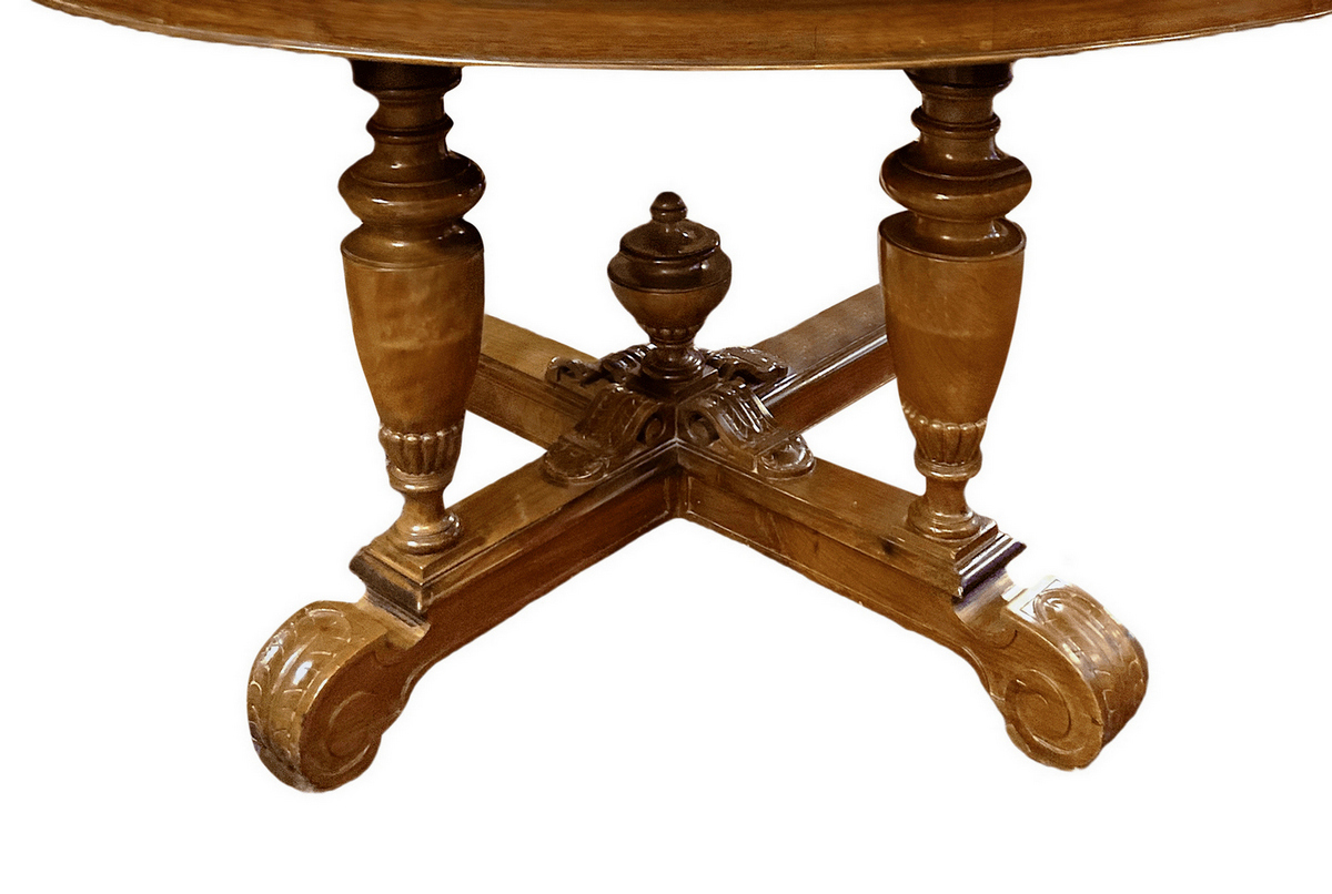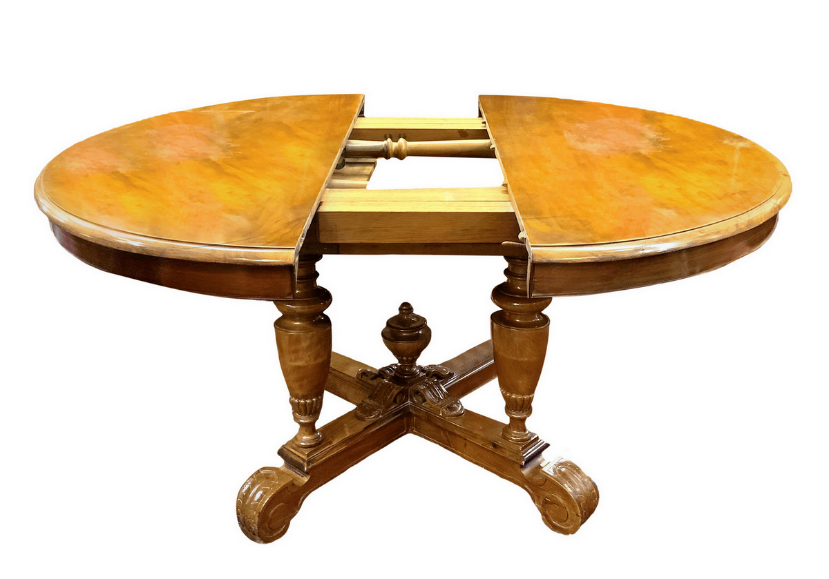 Tavolo da pranzo in legno di noce allungabile con piano ovale retto da quattro balaustre con piede a quattro razze, pigna al centro sulla crociera. H cm 76x. Piano cm 130x112