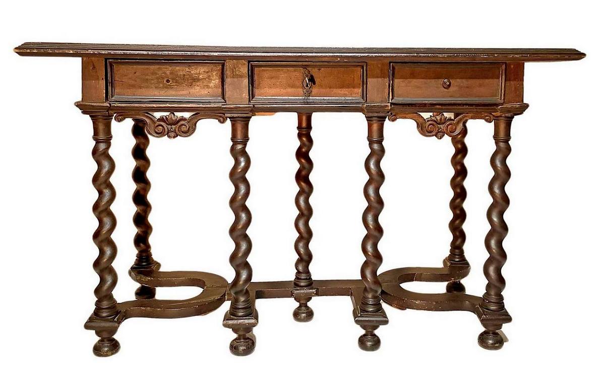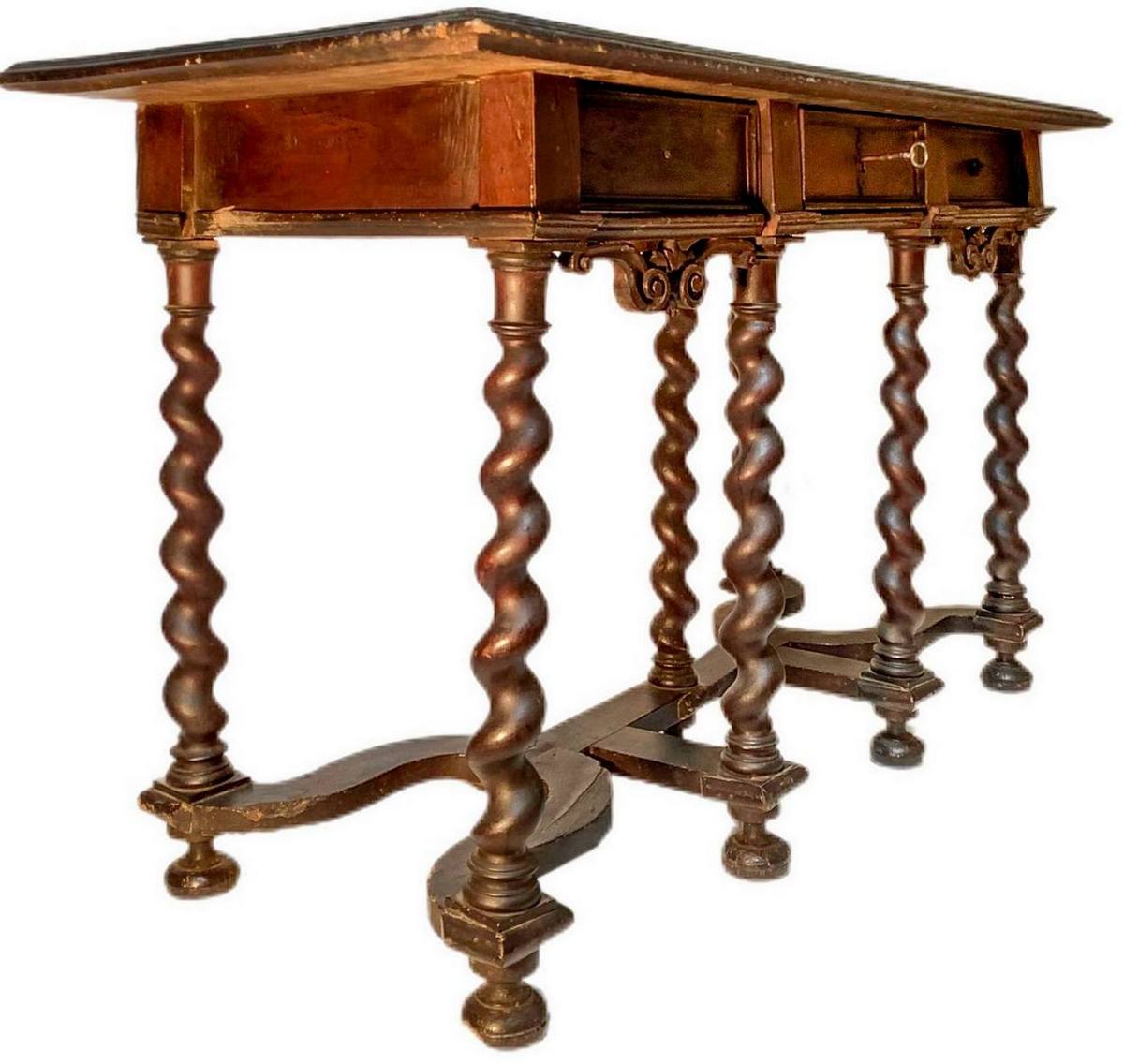 Tavolo scrittoio in legno massello di noce da muro, Luigi XIII, secolo XVII. Piano bordato a becco di civetta, tre cassetti al sottopiano n. 7 strutture a torciglione terminanti con basi a cipolla schiacciata. H cm 78x142x73