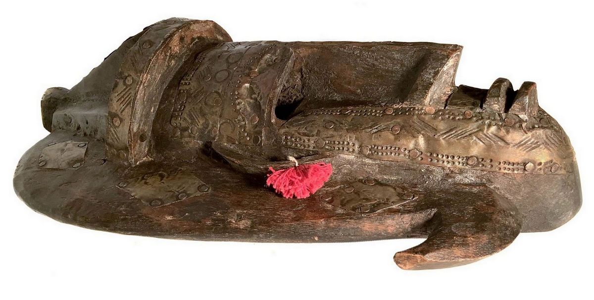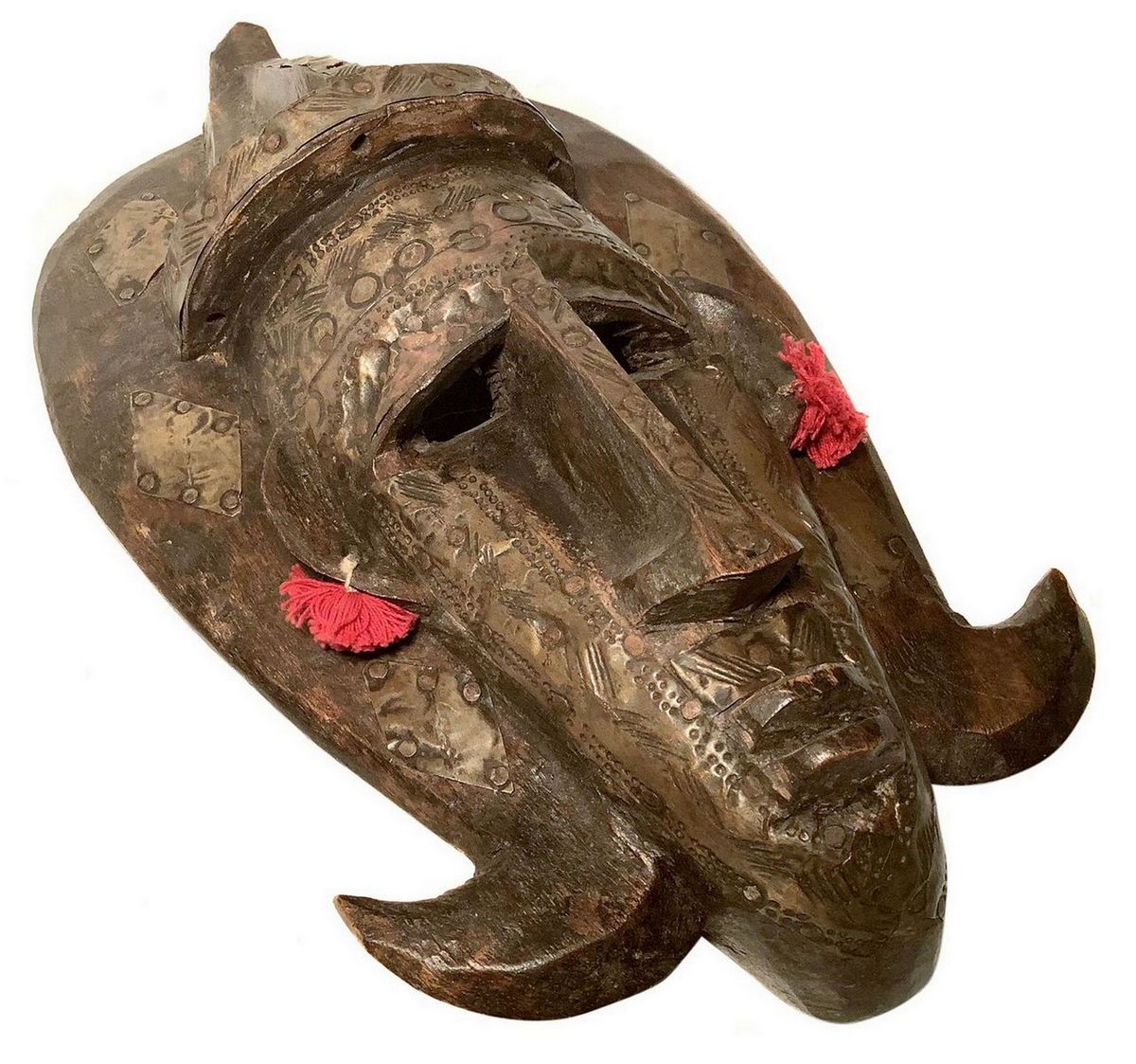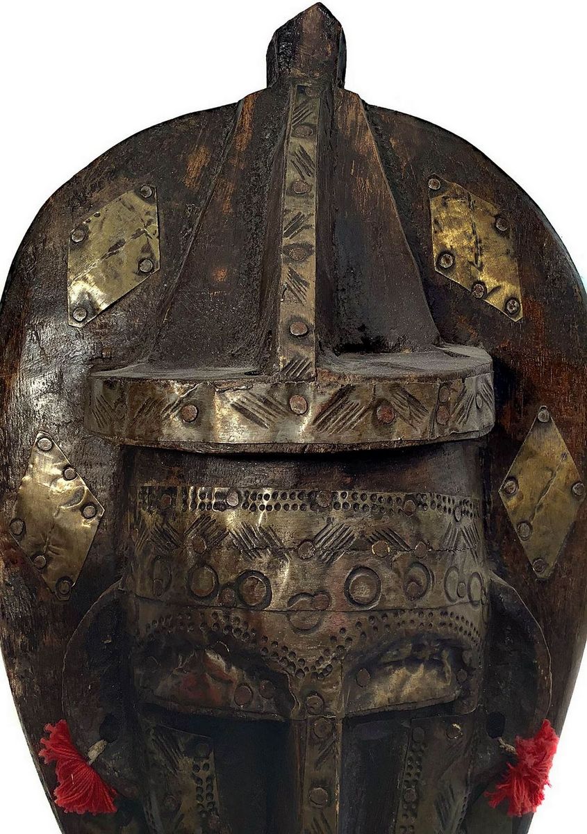Maschera africana con applicazioni in rame e di tessuto. Cm 34x18,5.