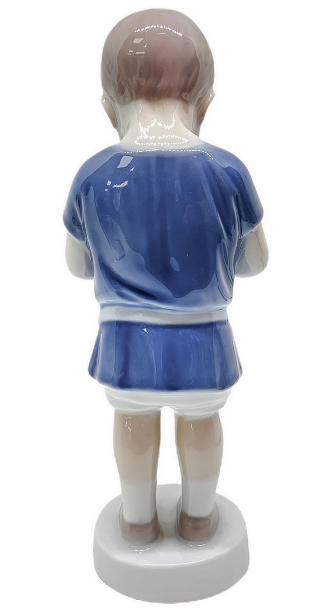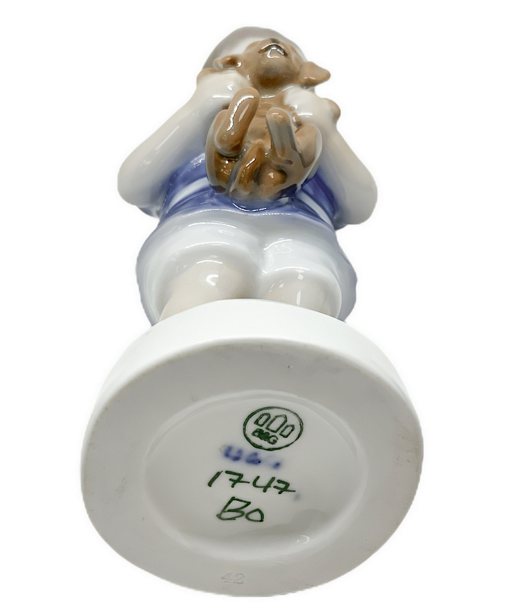 Copenaghen, statuetta in porcellana raffigurante bambino con cucciolo di cane. H cm 17,5