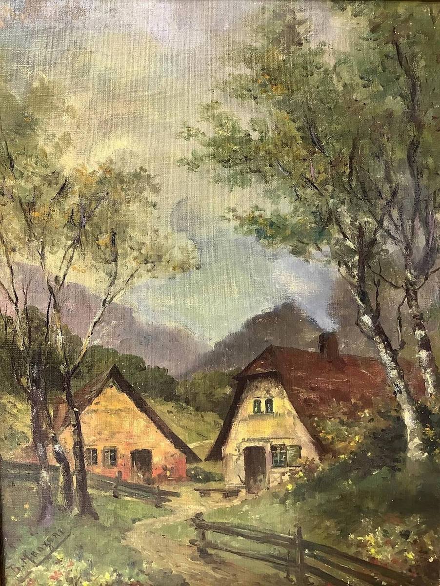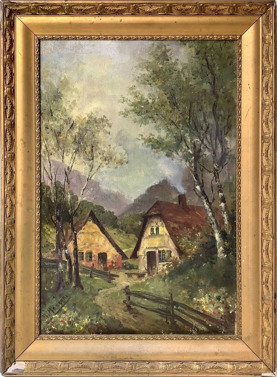Dipinto ad olio su tela con paesaggi e case, fine XIX secolo. Firmato in basso a sinistra. B.Manzoni.