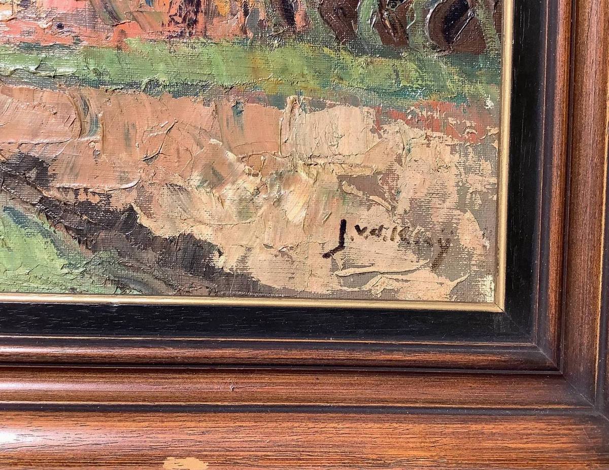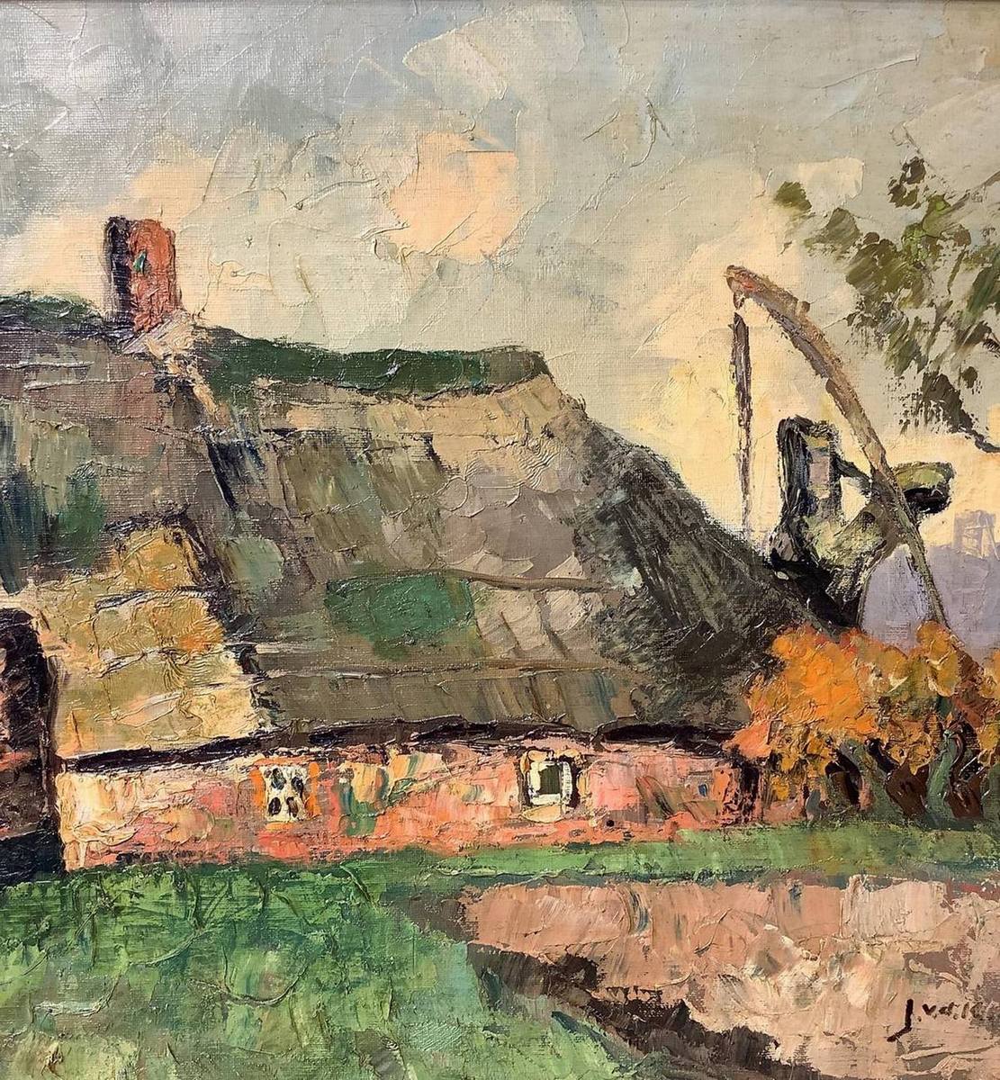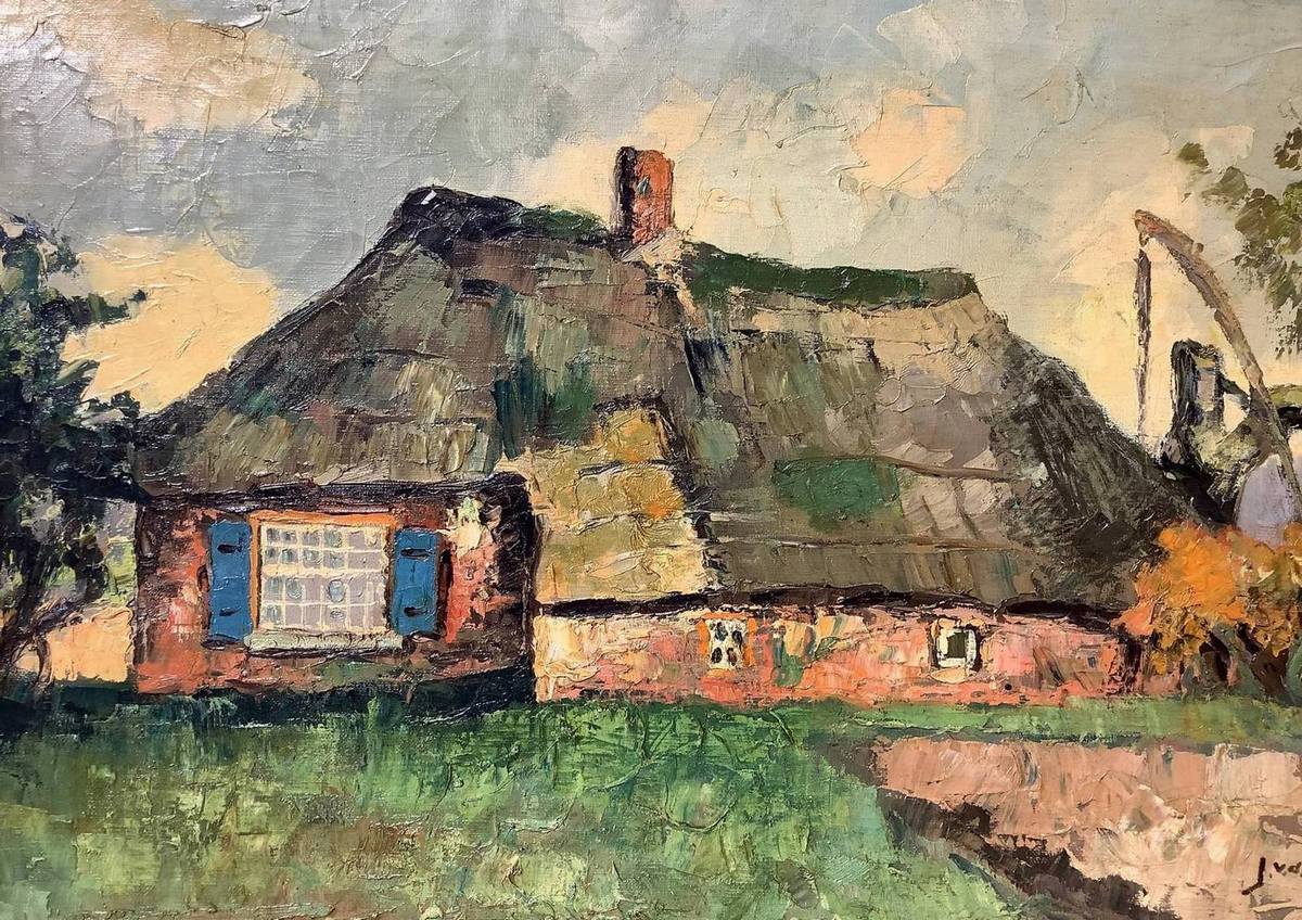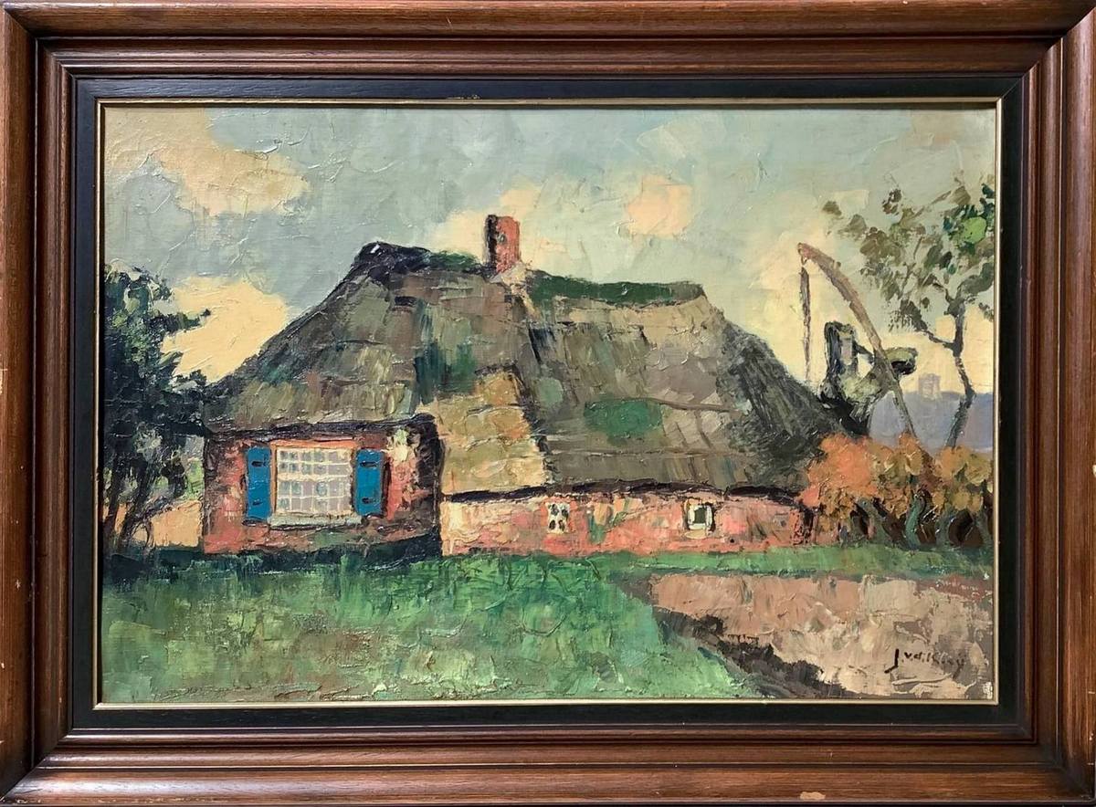 Dipinto ad olio su tela raffigurante casale di campagna. Firmata in basso a destra J. V. D. Klaj, XX secolo. Cm 38x58, i