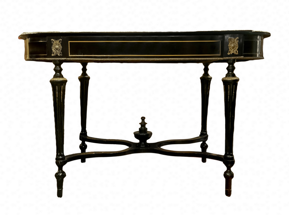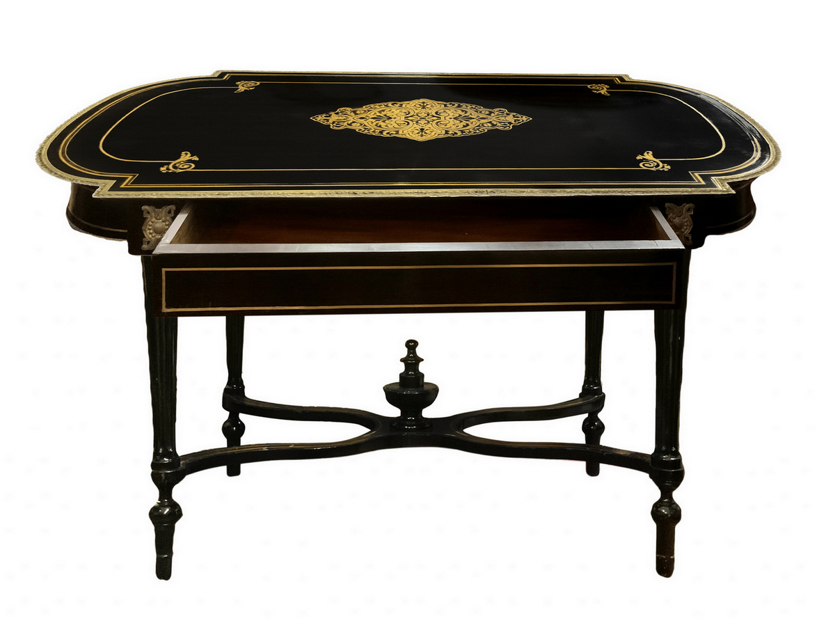 Tavolo da centro in legno nero ebanizzato, cassetto centrale, intarsio centrale al piano in ottone. Applicazioni di bronzo dorato su contorno e perfilato in ottone. Napoleone III. H cm 75x130x70. Ottimo stato