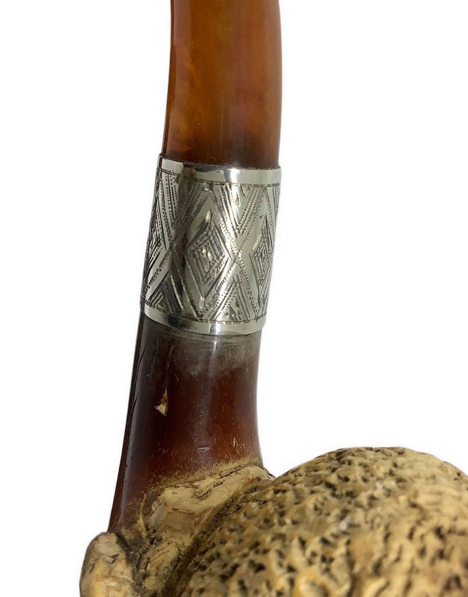 Pipa con fornello e cannello in schiuma, bocchino in ambra, anello di congiunzione in argento.