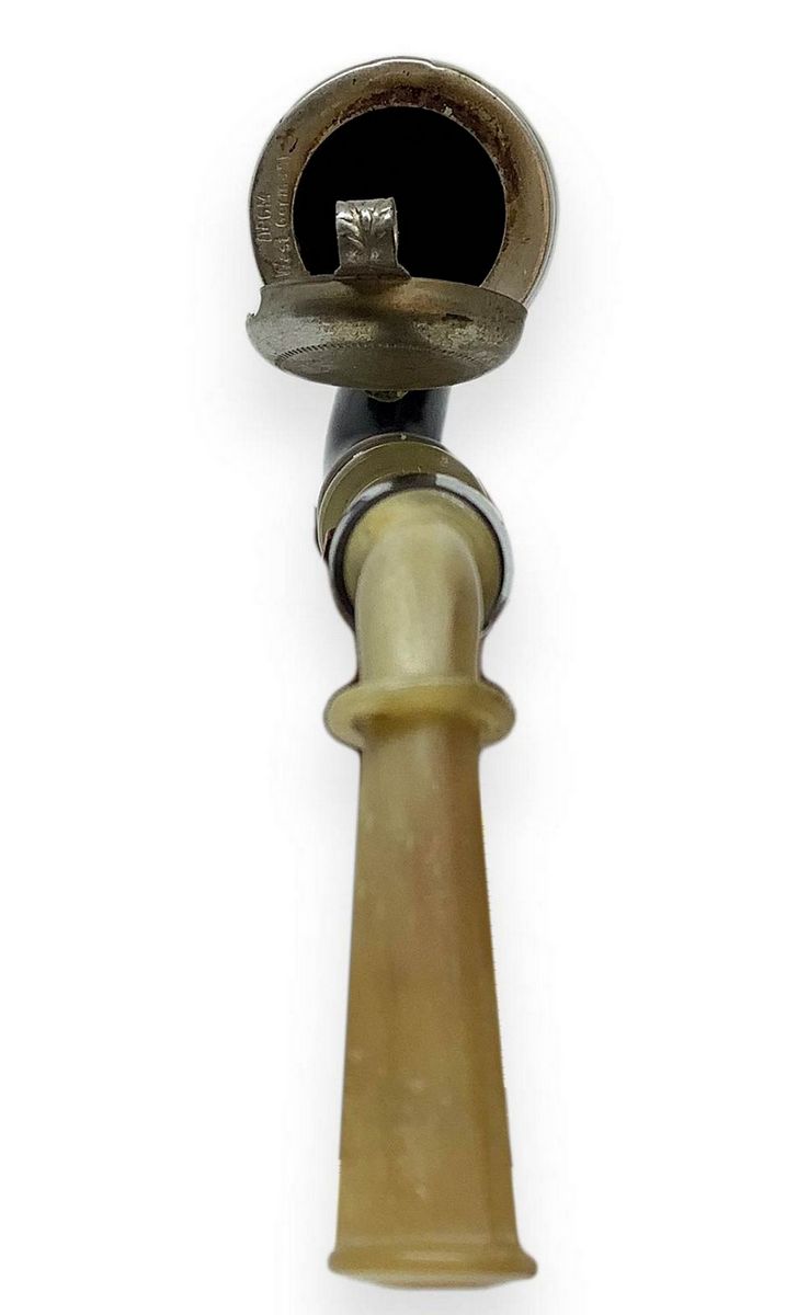 Pipa del tipo Tirolese con fornello in ceramica, cannello in corno e finiture in metallo ed ebanite.
