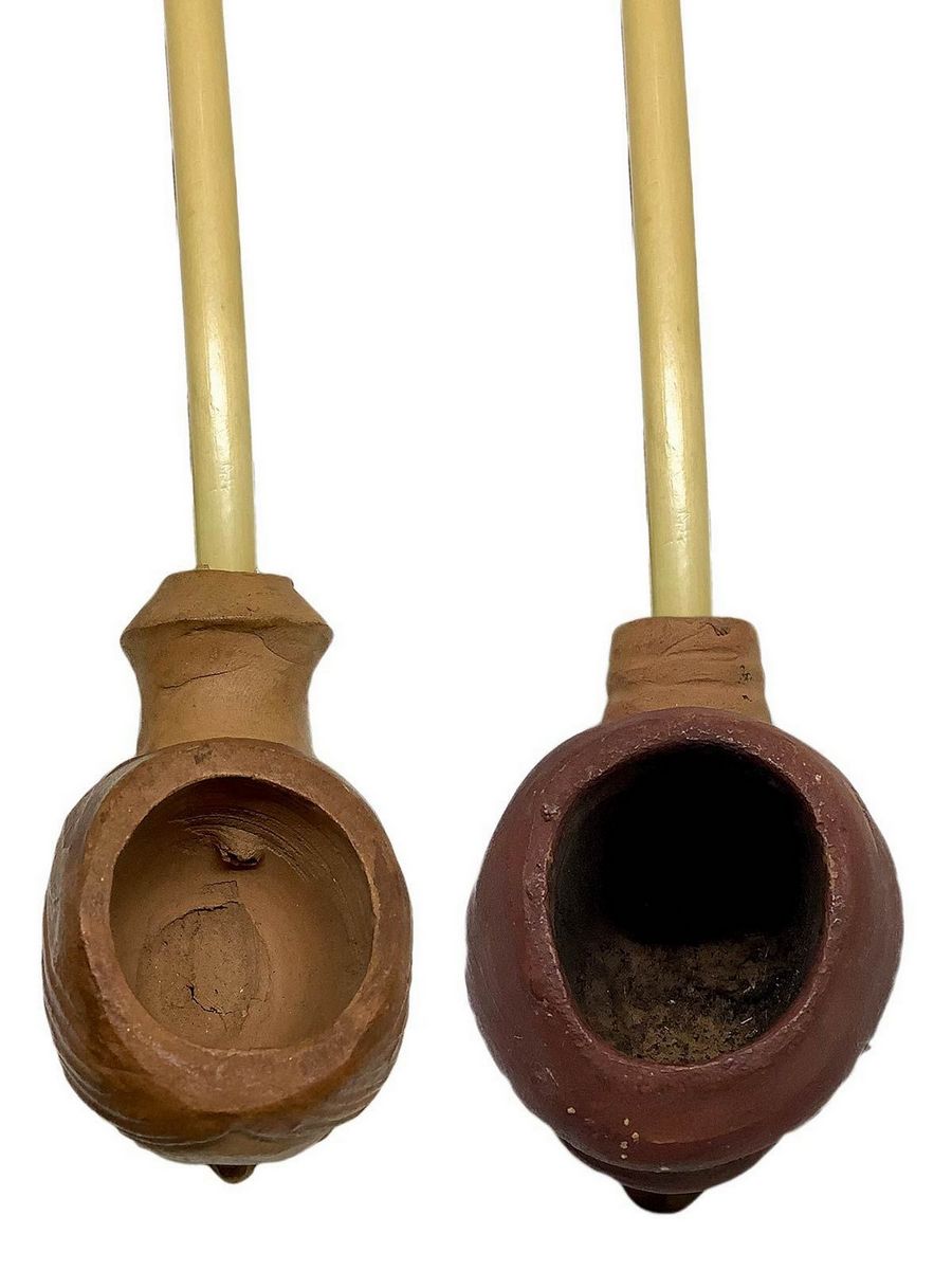 Pipa con fornello e cannello in argilla dipinta a mano, canna e bocchino in bambù
