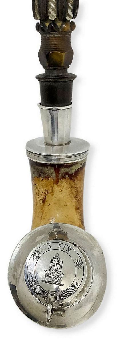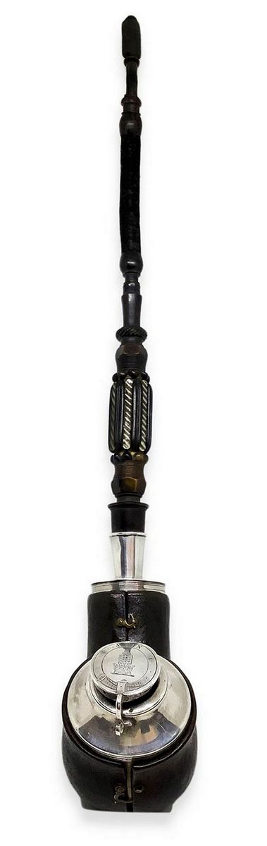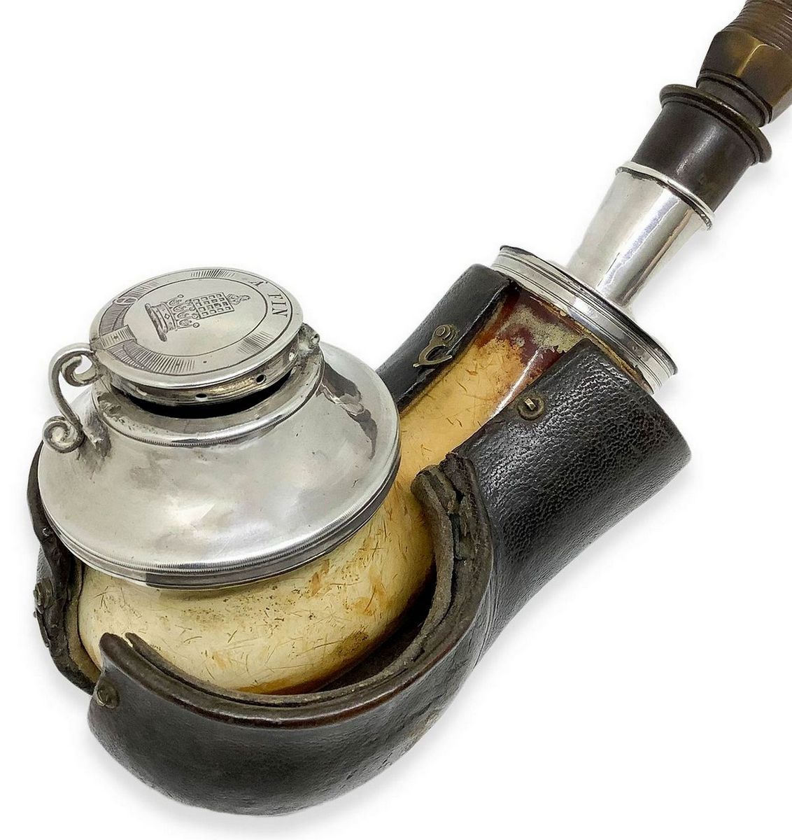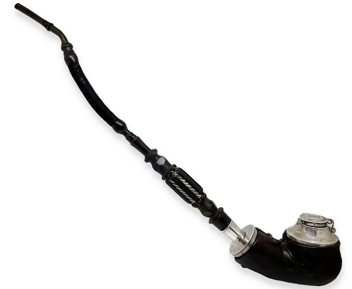 Pipa a boccetta di grandi dimensioni con fornello e cannello in schiuma, bocchino in corno, anello di congiunzione e finiture in argento.