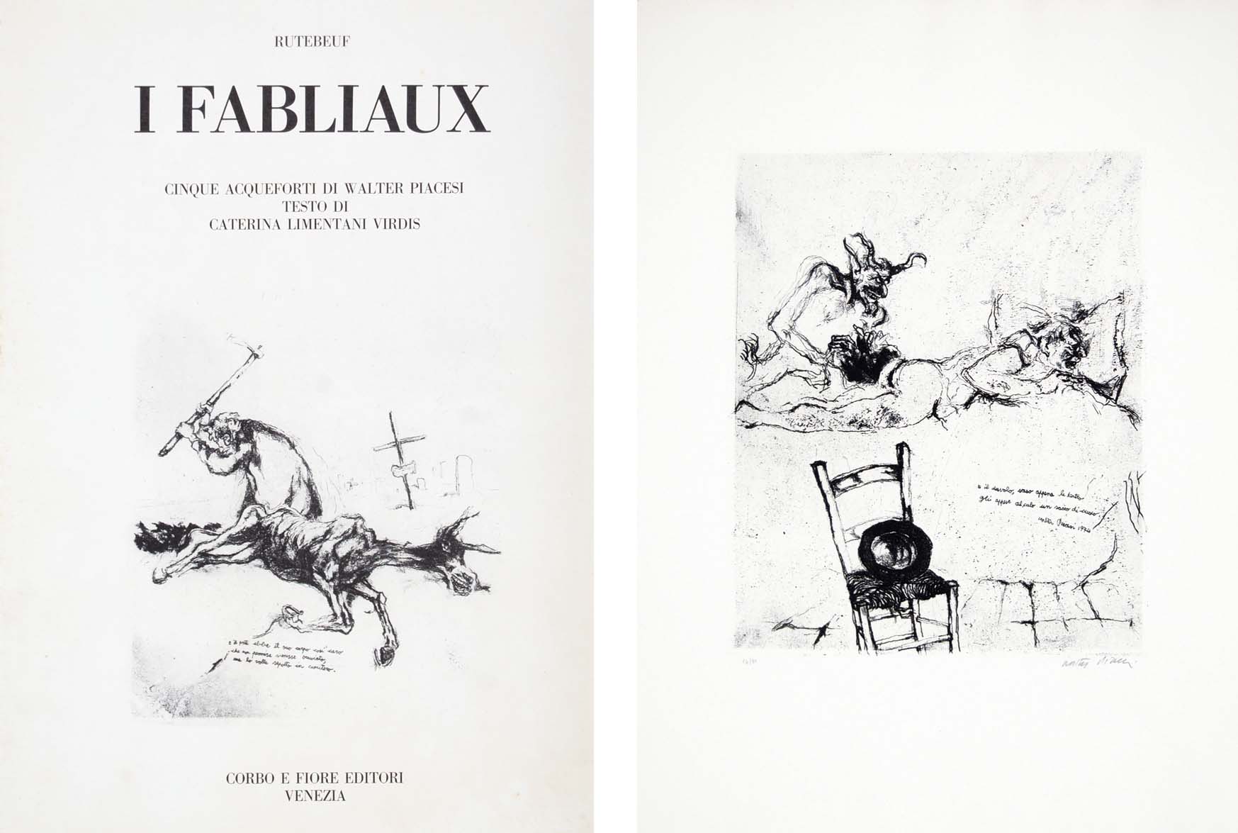 PIACESI WALTER Ascoli Piceno 1929 I Fabliaux 1974 cartella contenente 5 acqueforti es. 14/80 29x23 cm (lastra) 53x40 cm (foglio) tutte firmate e numerate in basso - Corbo e Fiore Editori Venezia, testo di Caterina Limentani Virdis