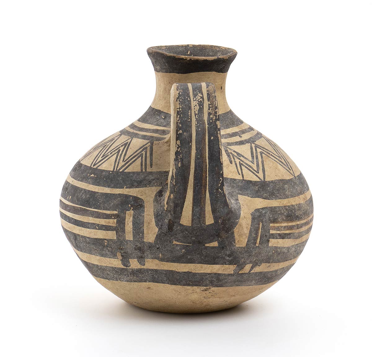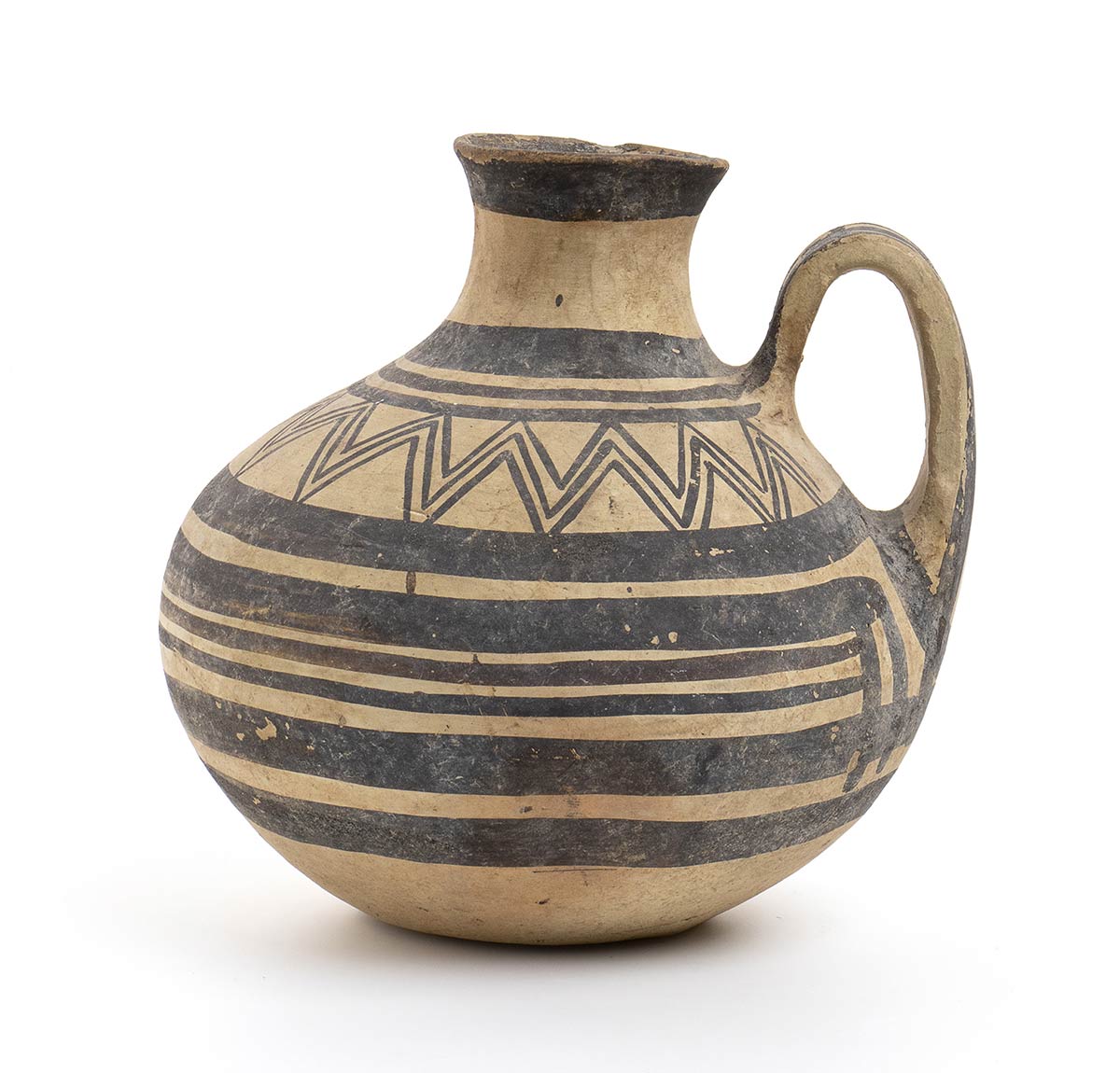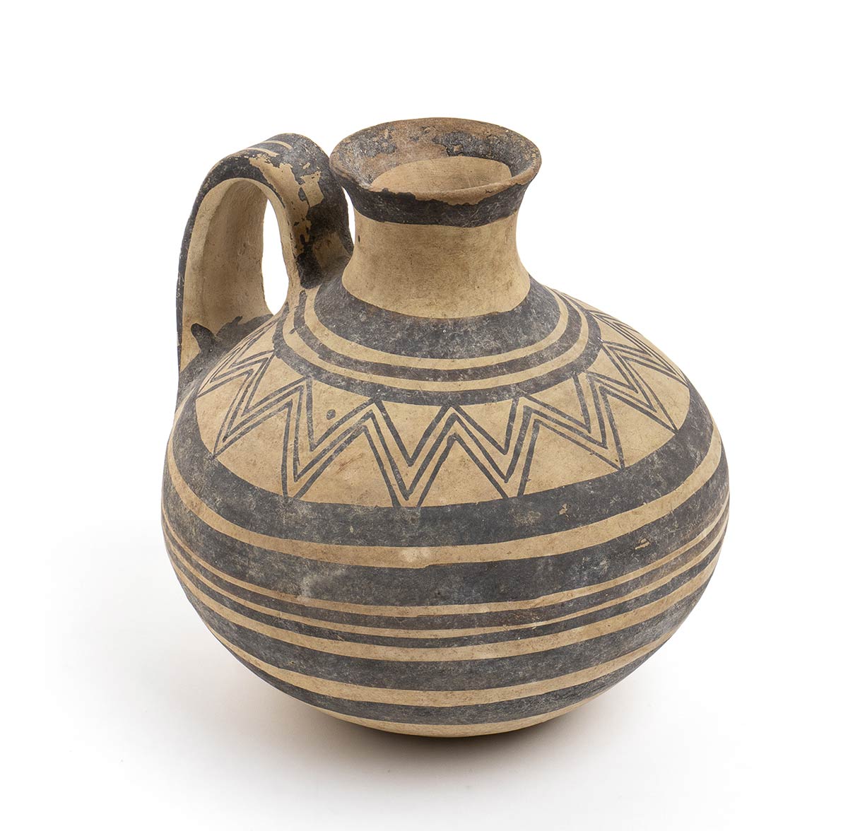 VI - V secolo a.C.; alt. cm 16,4; Forma vascolare non comune, monoansata, con bella decorazione continua a denti di lupo e cerchi concentrici. Integra, minime sovaddipinture posticce intorno alla base dell’ansa.