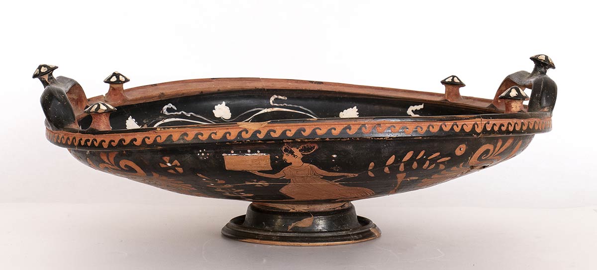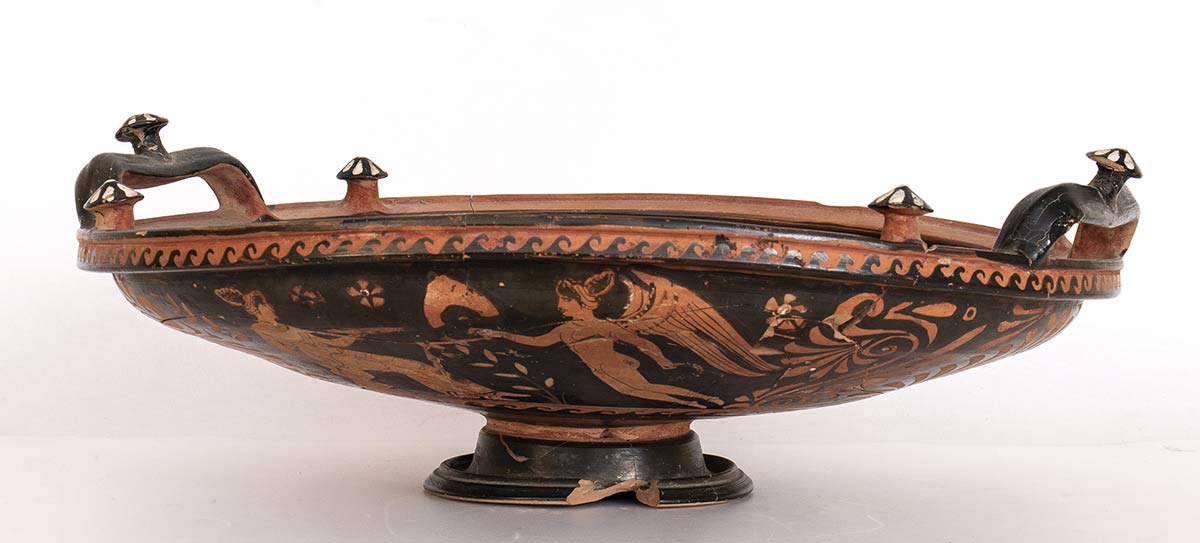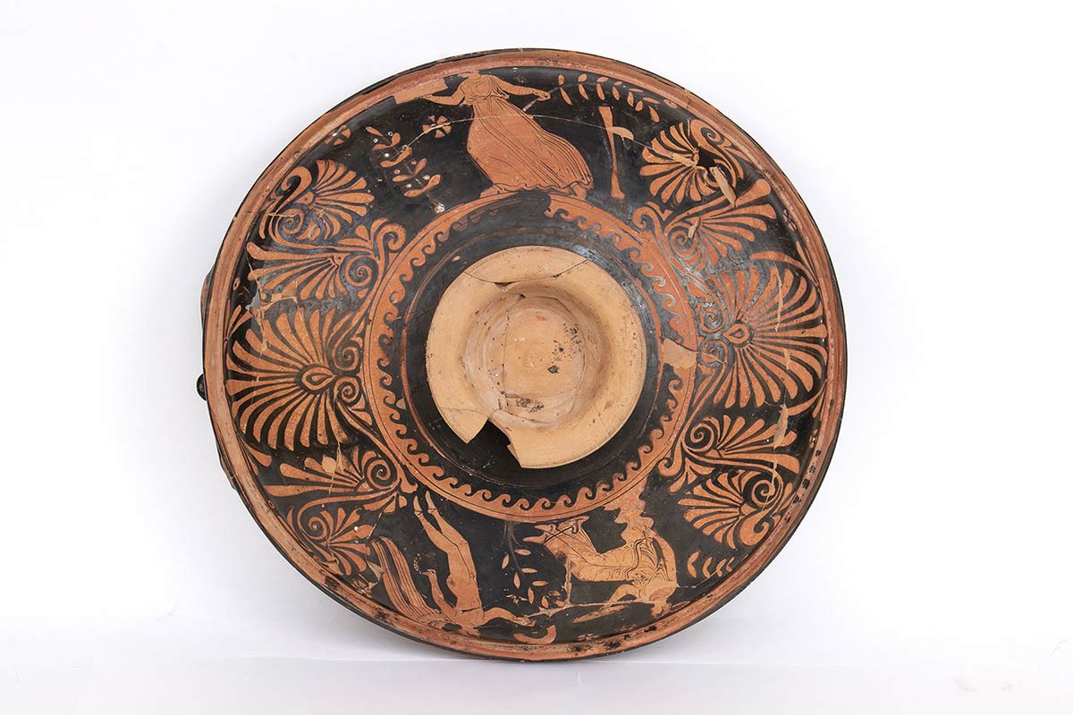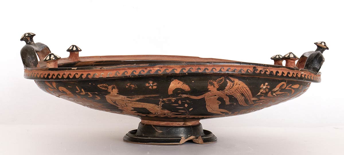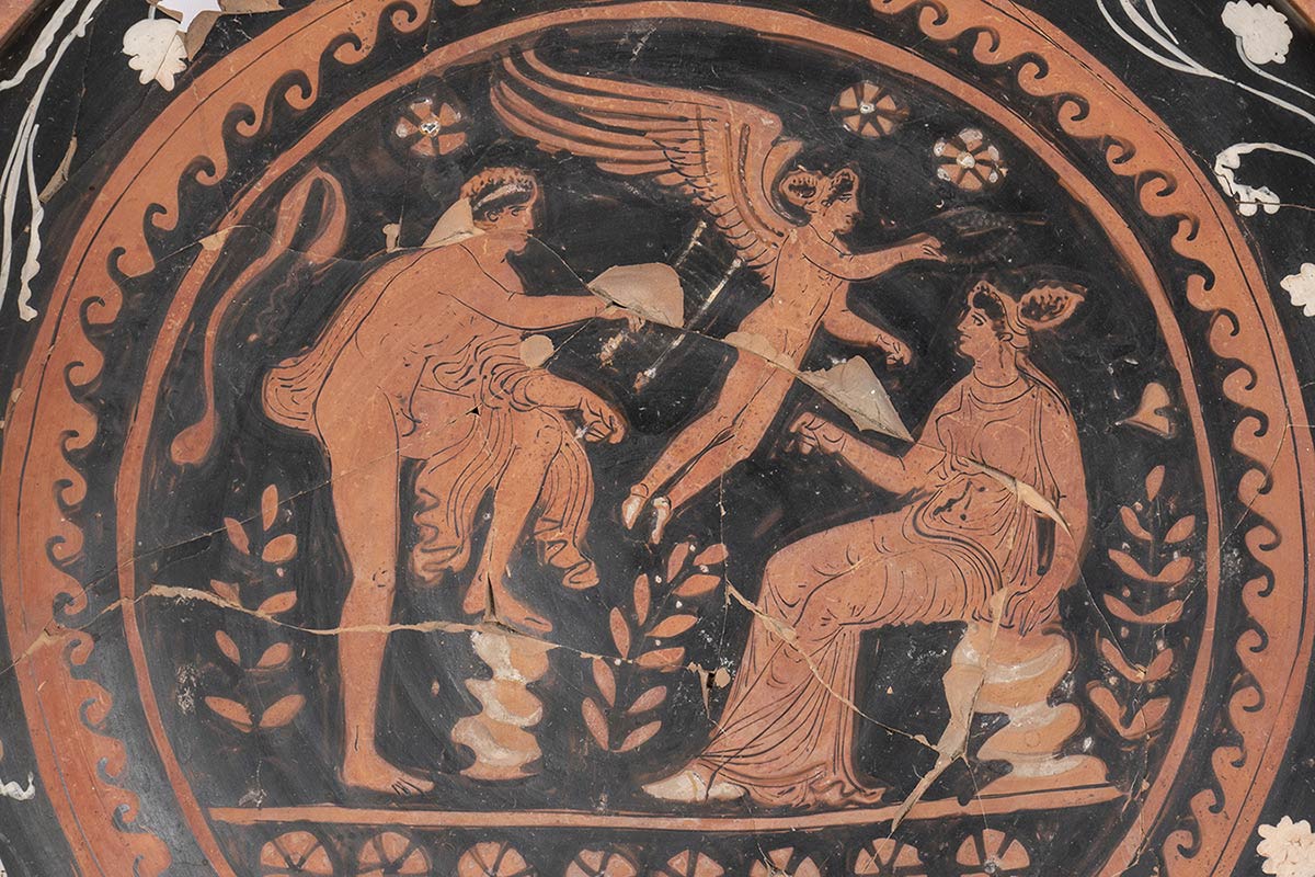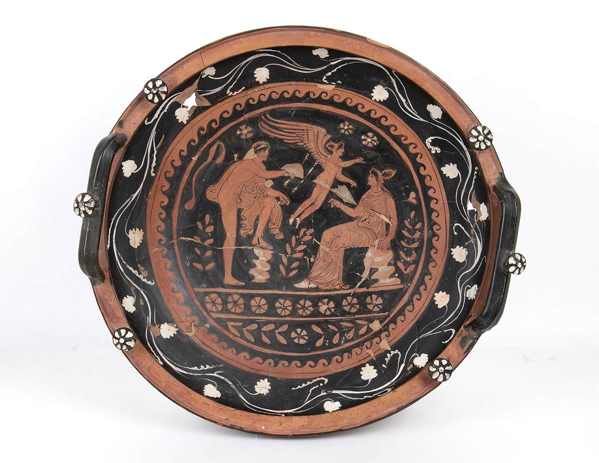 Attribuito al gruppo dei Pittori di Dario e dell’Oltretomba, 340 - 330 a.C.; diam. cm 45,5; alt. cm 17; Phiale apula di grandezza eccezionale, contraddistinta dalla presenza di due grandi anse verticali a maniglia, intorno e sulle quali sono applicati bottoni plastici. Nel centro del piatto, racchiusa da cornici floreali e ad onde correnti, è una scena di corteggiamento ambientata in un giardino: a destra è una donna seduta sulle rocce, vestita con un peplo e indossante una fascia alta sui capelli; di fronte è un giovane nudo, con una clamide avvolta sul braccio. Al centro Eros in volo incorona la donna. Ricomposta da alcuni frammenti, con minime mancanze.