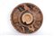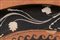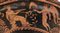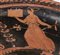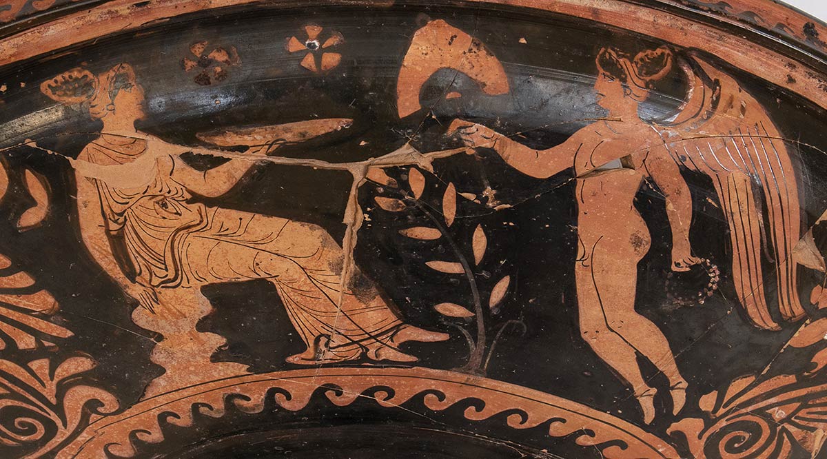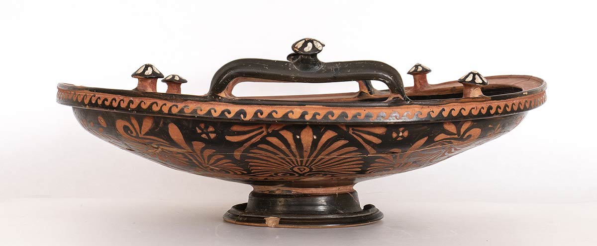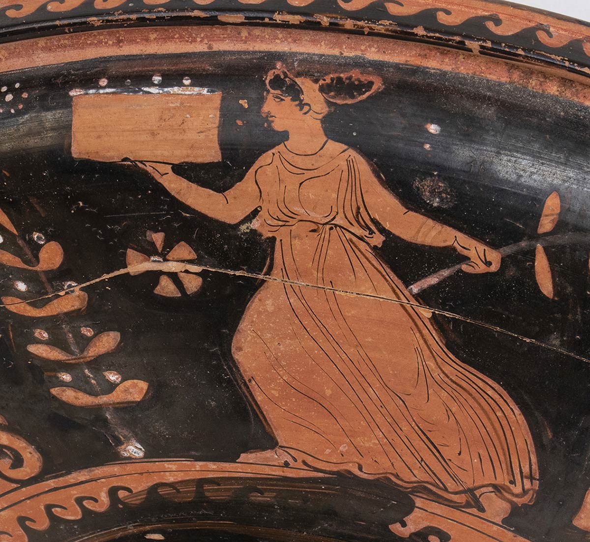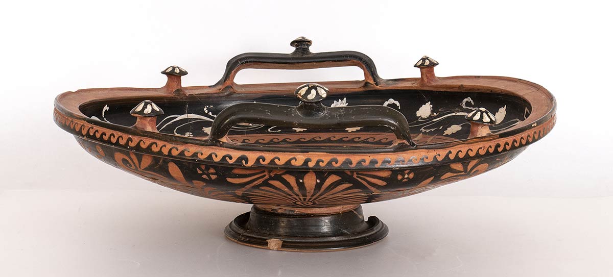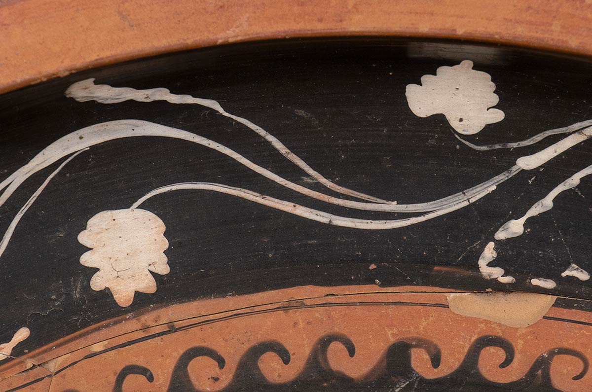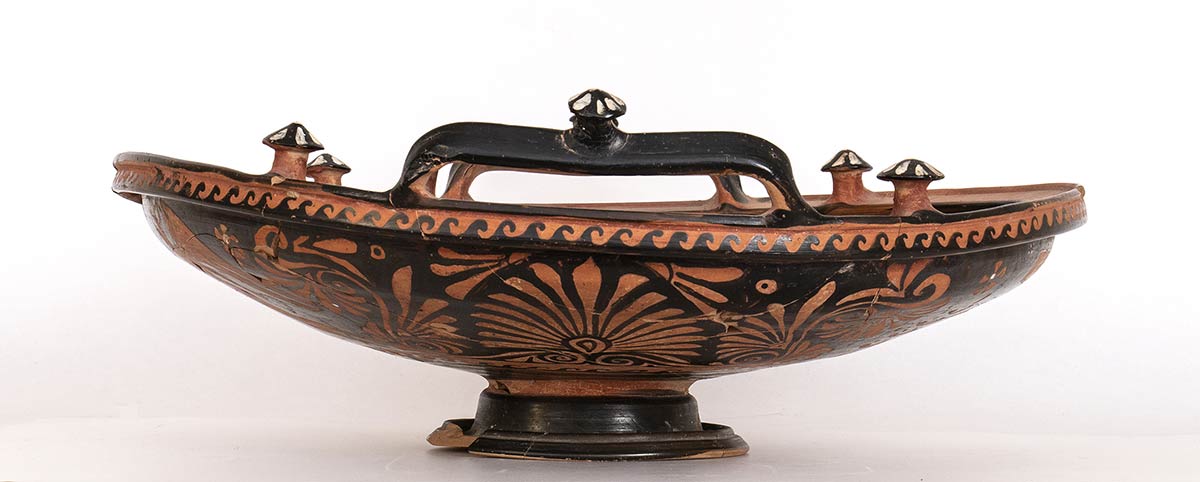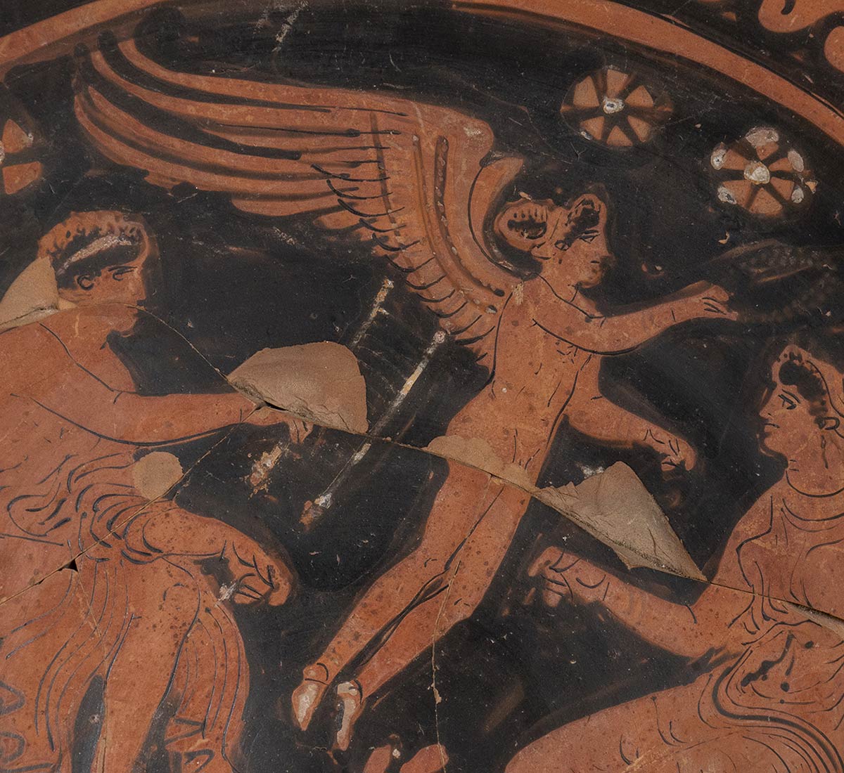 Attribuito al gruppo dei Pittori di Dario e dell’Oltretomba, 340 - 330 a.C.; diam. cm 45,5; alt. cm 17; Phiale apula di grandezza eccezionale, contraddistinta dalla presenza di due grandi anse verticali a maniglia, intorno e sulle quali sono applicati bottoni plastici. Nel centro del piatto, racchiusa da cornici floreali e ad onde correnti, è una scena di corteggiamento ambientata in un giardino: a destra è una donna seduta sulle rocce, vestita con un peplo e indossante una fascia alta sui capelli; di fronte è un giovane nudo, con una clamide avvolta sul braccio. Al centro Eros in volo incorona la donna. Ricomposta da alcuni frammenti, con minime mancanze.