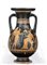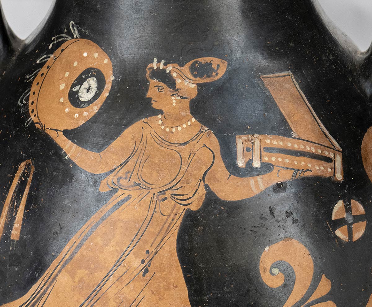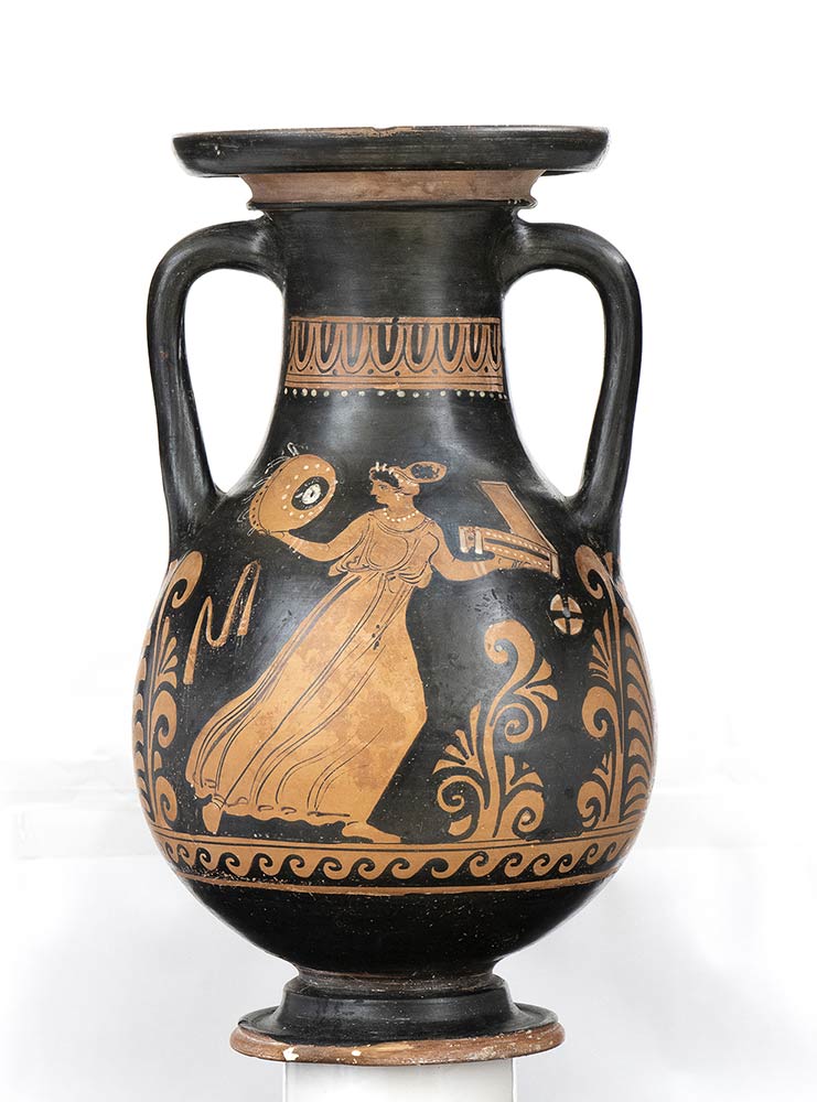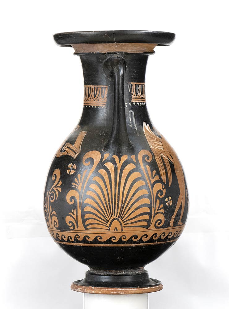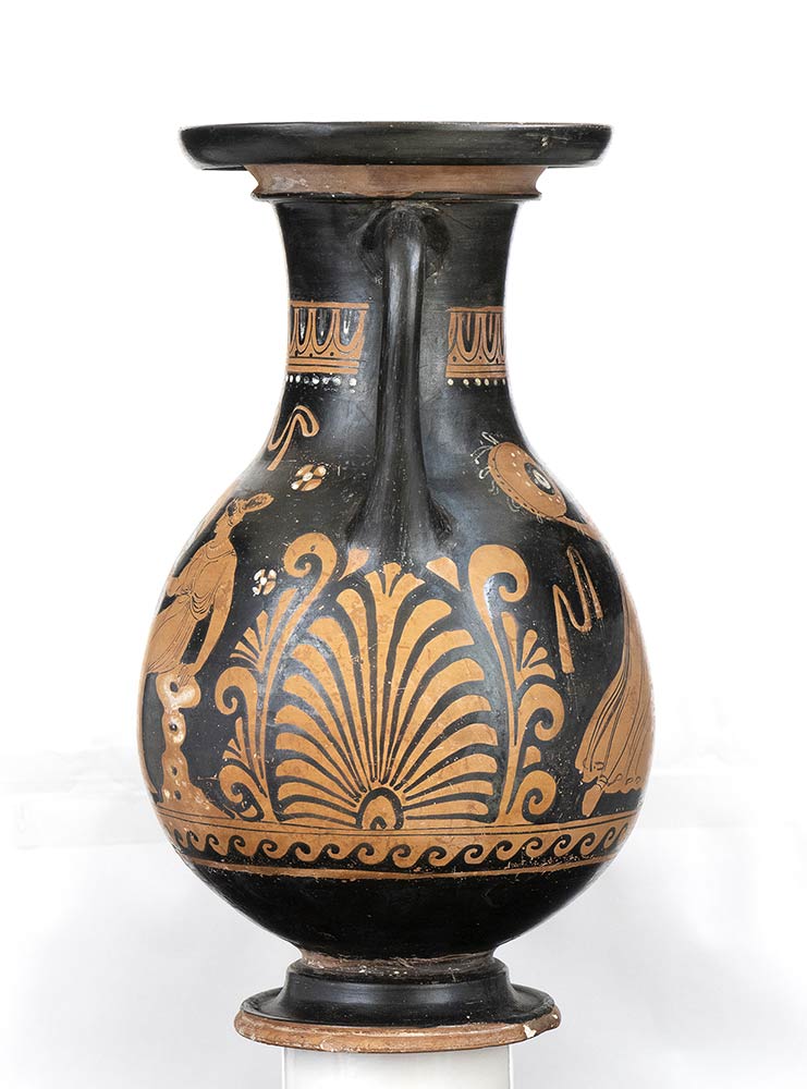 IV secolo a.C.; alt. cm 32,2; diam. cm 15,5; Sul fronte, un erote androgino con patera che si volge verso una donna assisa su delle rocce e con ventaglio in mano. Sul retro, una ragazza in corsa verso destra, con uno scrigno e un tamburello. Teoria di palmette al di sotto delle anse. Insignificanti restauri sparsi, tra cui una minima ricostruzione in gesso sul piede.