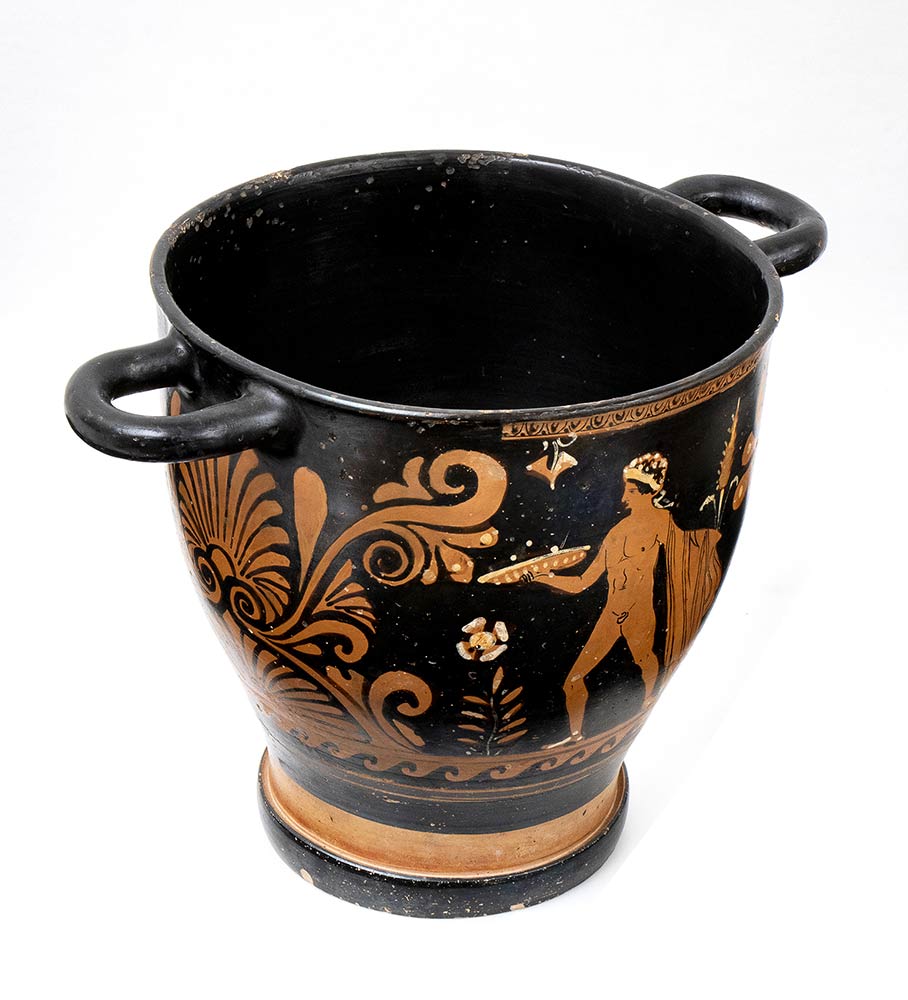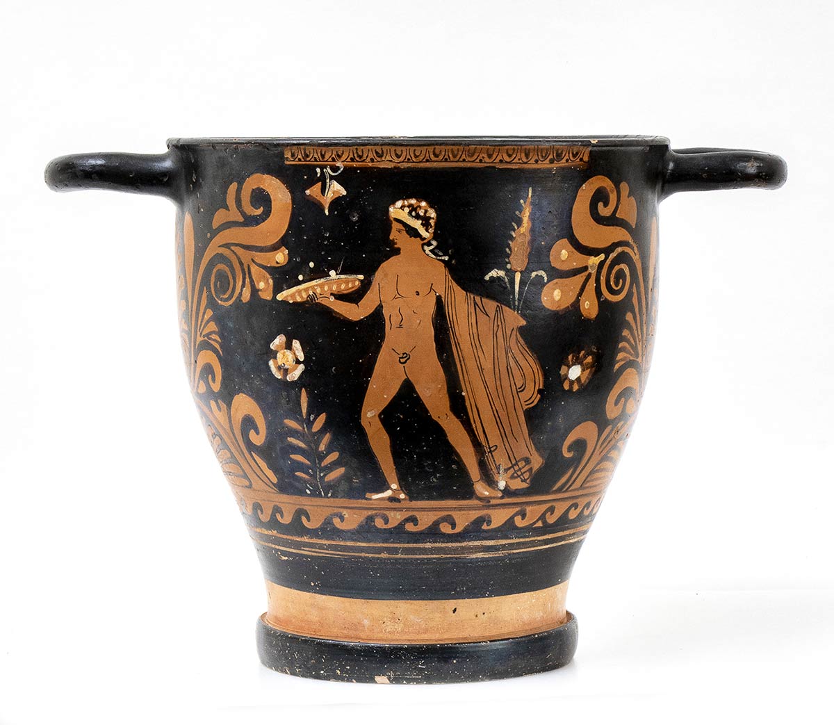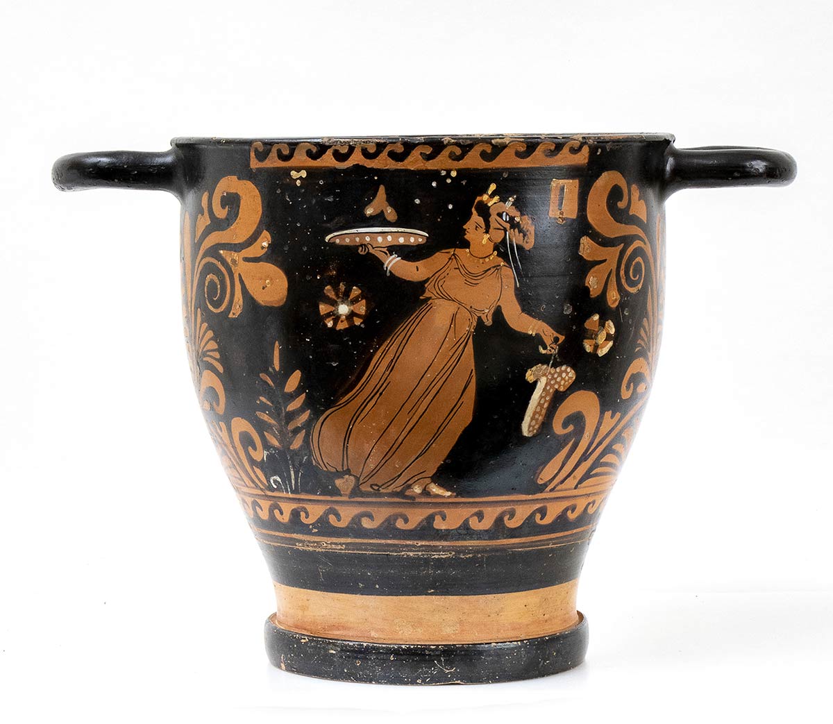 IV secolo a.C.; alt. cm 28,2; diam. cm 27; Grande skyphos a figure rosse completamente intatto; da un lato è una figura maschile in nudità con tirso e piatto di frutta; dall’altro una donna in corsa con grappolo d’uva e piatto di frutta. Teoria di palmentte sotto le anse.