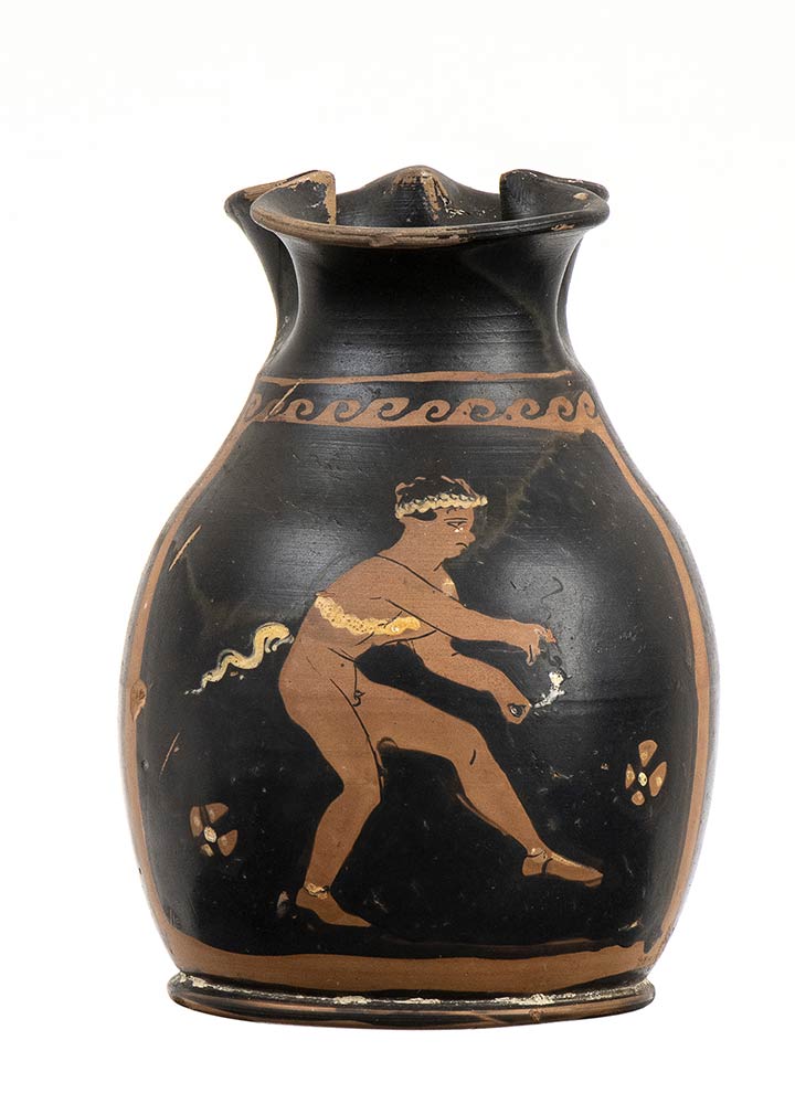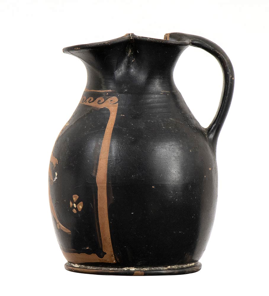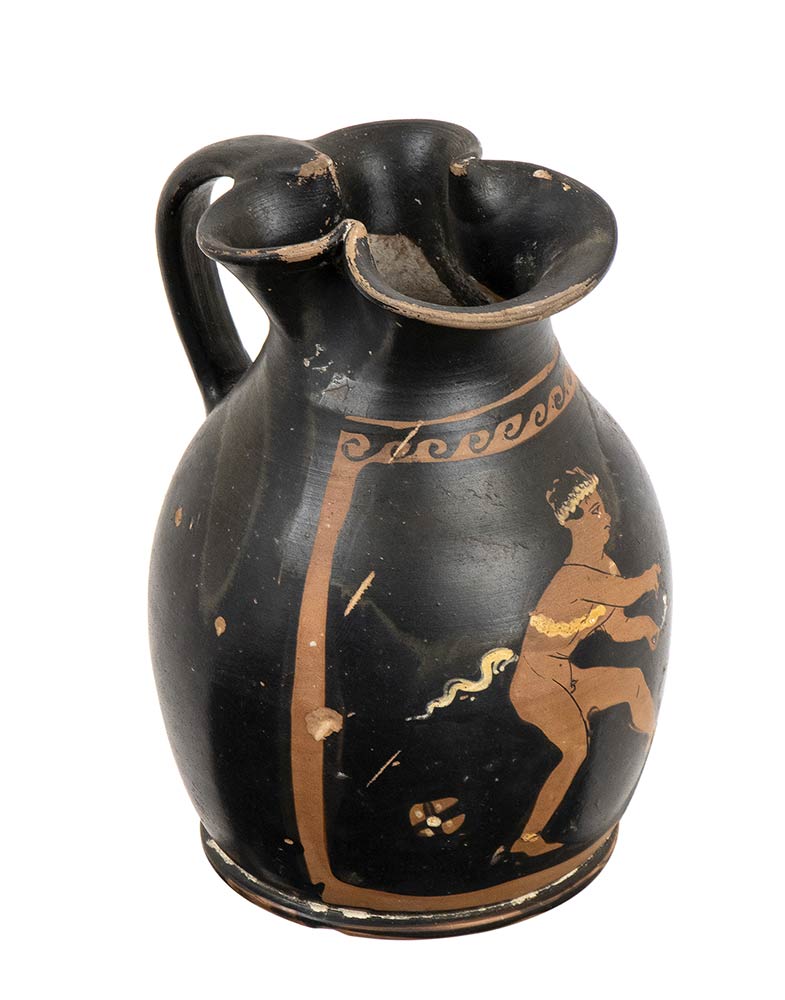 IV secolo a.C.; alt. cm 13; Elegante piccola oinochoe trilobata apula con Satiro andante verso destra. Intatta, solo un'insignificante scheggiatura.