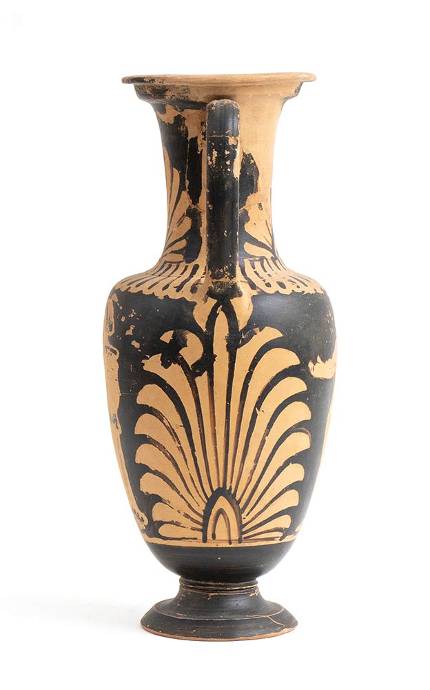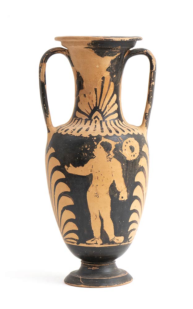 Seconda metà del IV secolo a.C.; alt. cm 29,5; Su di un lato vi è una figura femminile ammantata; sull’altro, un atleta in nudità. Teoria di palmette a decorare il collo e gli spazi sotto le anse. Evidenti cadute di colore, anse restaurate.