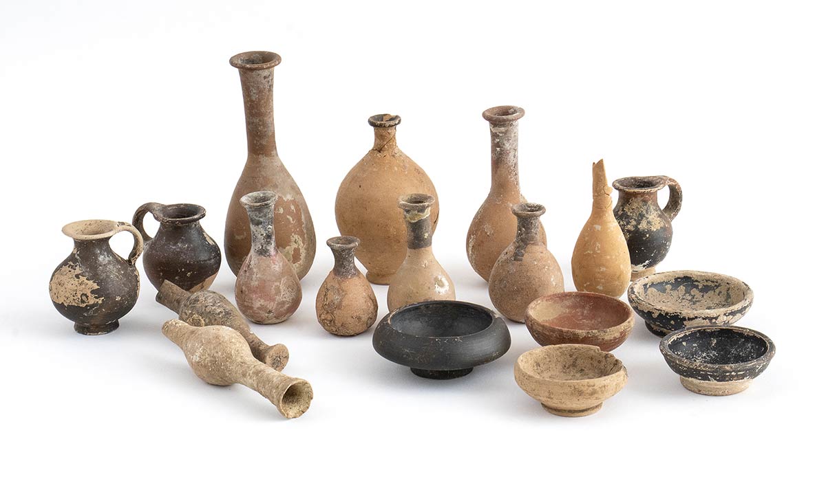 III - I secolo a.C.; alt. cm 17 - 6,5; diam. cm 8 - 2; Gruppo di vari vasetti a vernice nera: cinque piccole ciotole, tre brocche miniaturistiche, e dieci balsamari. Evidenti cadute di colore e piccole mancanze.