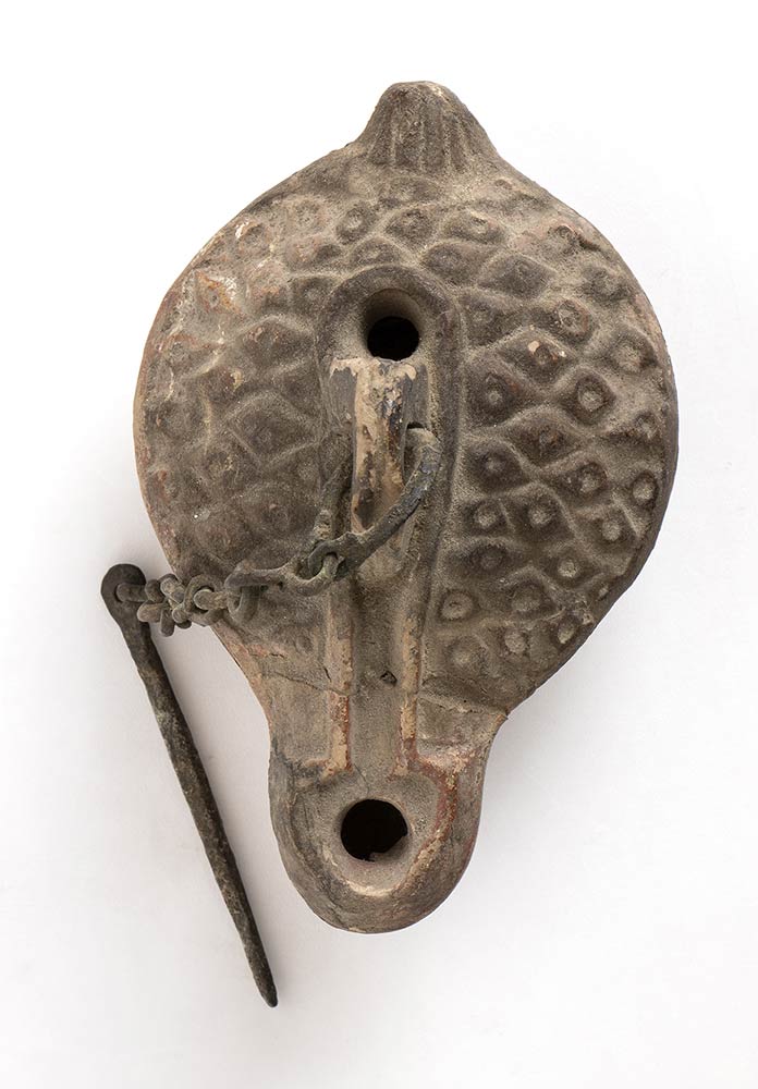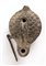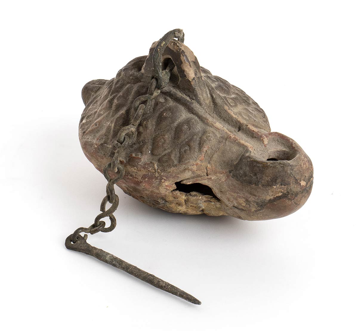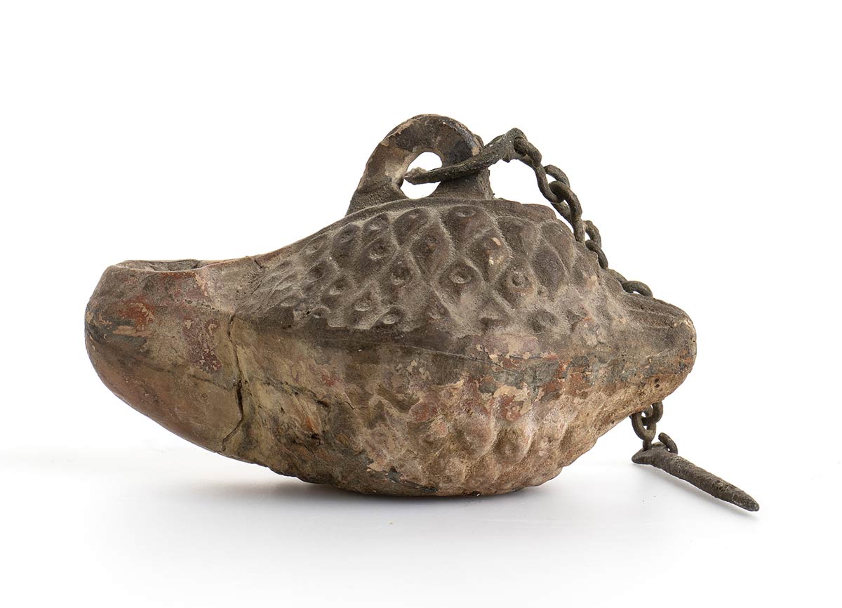 I - II secolo d.C.; lungh. cm 12,5; Deliziosa lucerna in terracotta con catenella di sospensione in bronzo. Restauro integrativo sul becco e piccola mancanza sulla pancia.