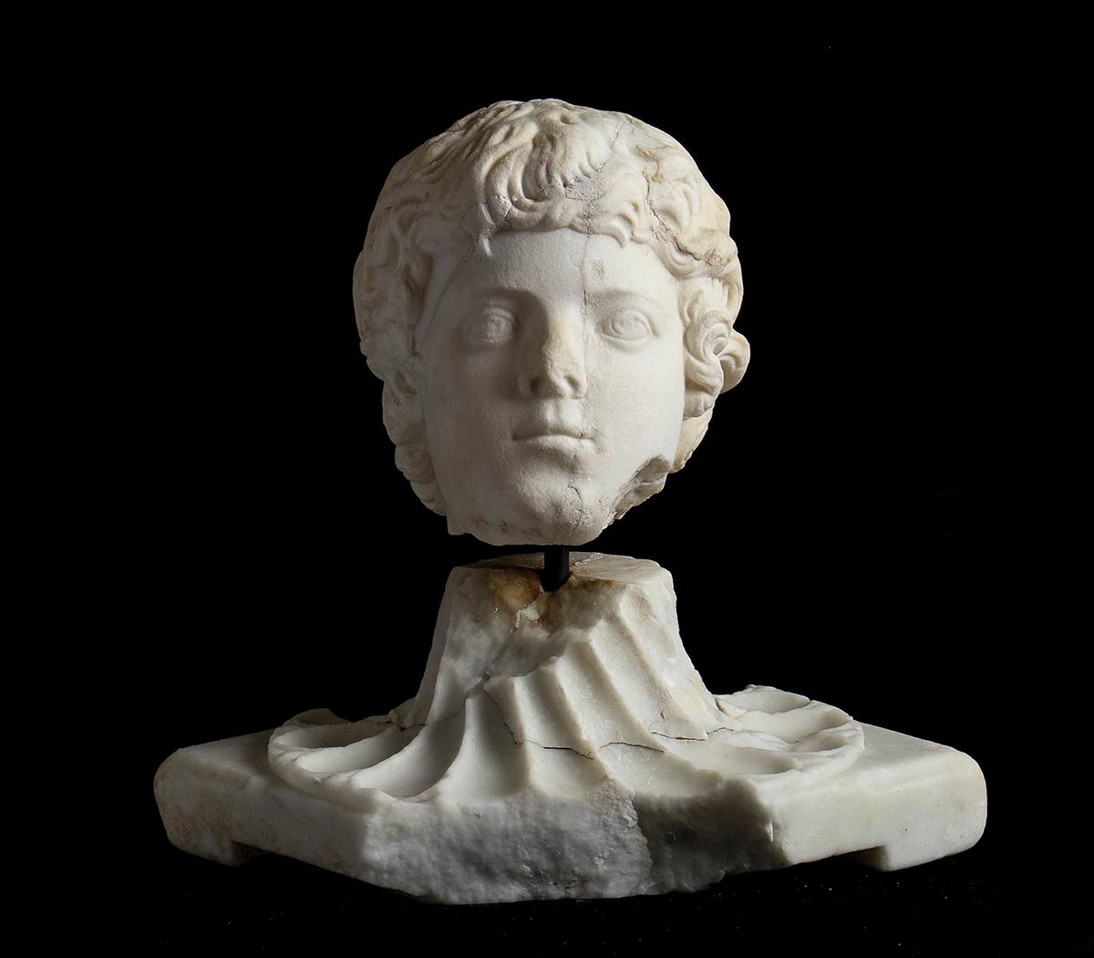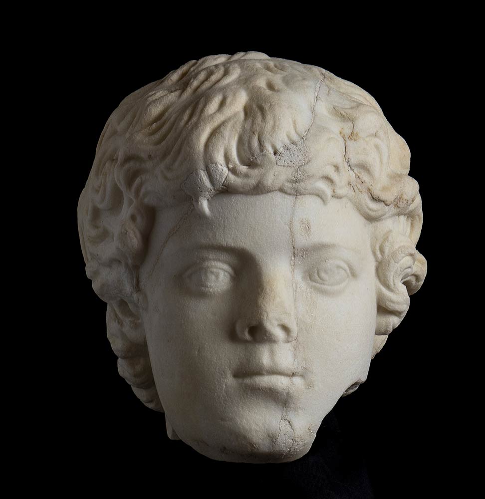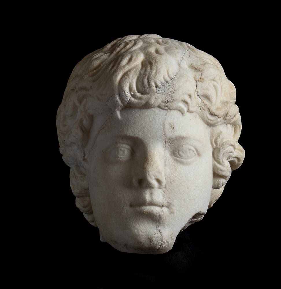 II secolo d.C.; alt. totale cm 36; alt. testa cm 20, lungh. cm 16; base quadrata originariam. cm 30 x 30, diagonale cm 40; Delizioso ritratto di un fanciullo dell'età approssimativa di 8/10 anni, con folti riccioli che nella resa rimandano alla moda dell'età antonina. Sulla nuca è una fresatura, forse eseguita per un restauro coevo; sull'intera superficie del ritratto sono crepe colmate con gesso. In epoca recente lo stesso è stato montato con un perno in ferro su di una base marmorea pertinente ad una colonnina tortile.