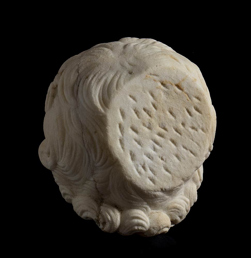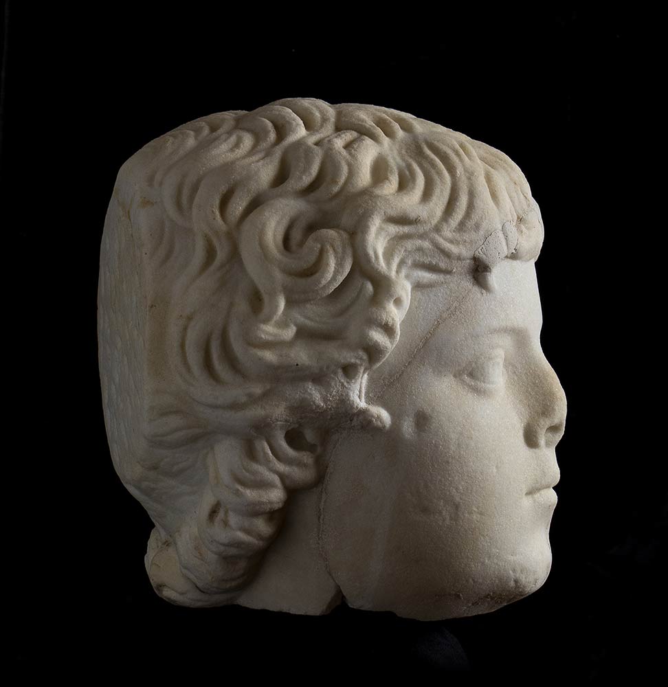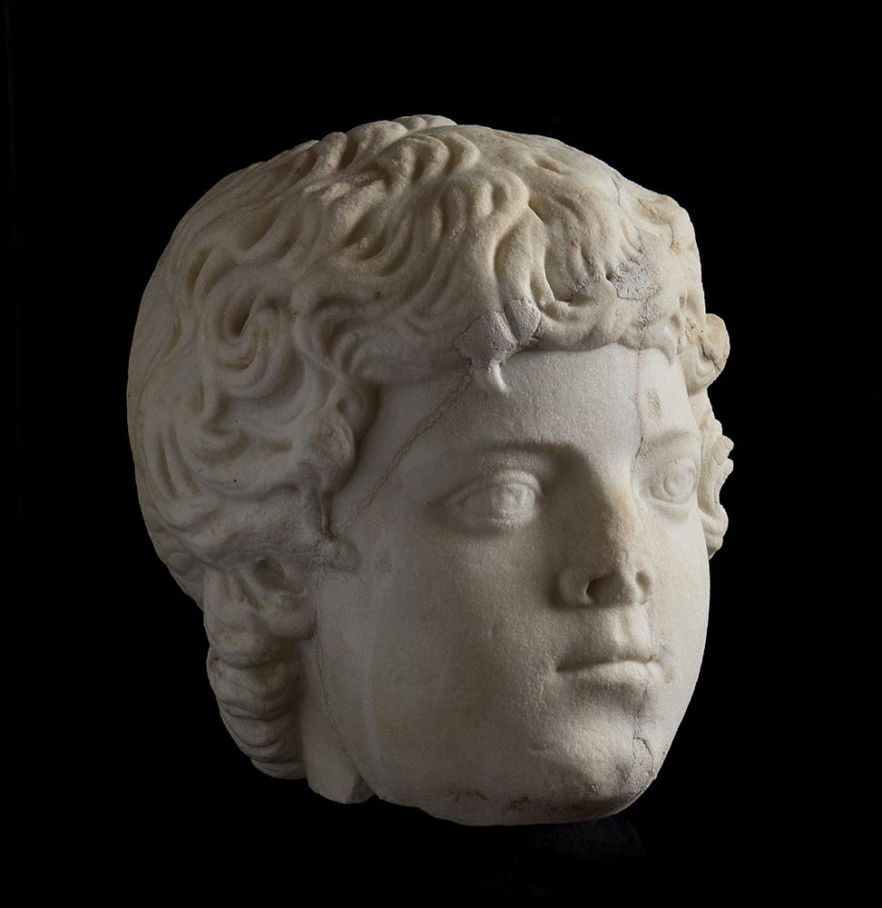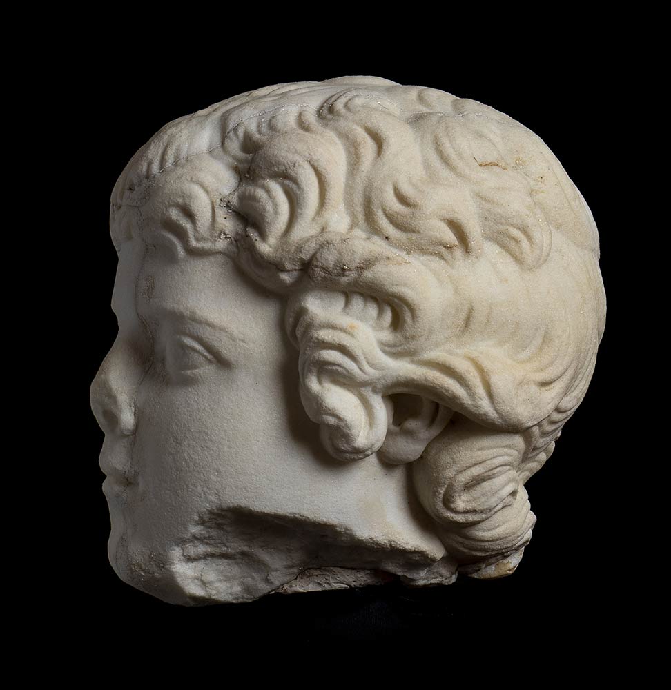 II secolo d.C.; alt. totale cm 36; alt. testa cm 20, lungh. cm 16; base quadrata originariam. cm 30 x 30, diagonale cm 40; Delizioso ritratto di un fanciullo dell'età approssimativa di 8/10 anni, con folti riccioli che nella resa rimandano alla moda dell'età antonina. Sulla nuca è una fresatura, forse eseguita per un restauro coevo; sull'intera superficie del ritratto sono crepe colmate con gesso. In epoca recente lo stesso è stato montato con un perno in ferro su di una base marmorea pertinente ad una colonnina tortile.