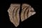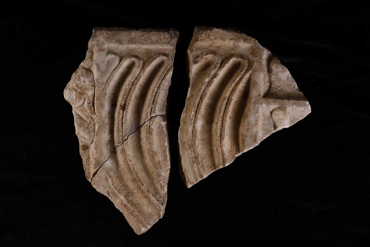 III - IV secolo d.C.; alt. cm 27 - 18; spessore massimo cm 5; (alt. tot. cm 35); Tre frammenti pertinenti alla fronte di un sarcofago marmoreo strigilato. Tracce di riquadro centrale con figura maschile scolpita.