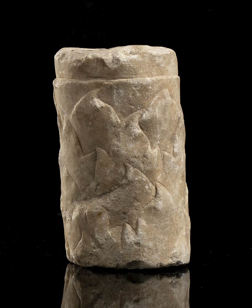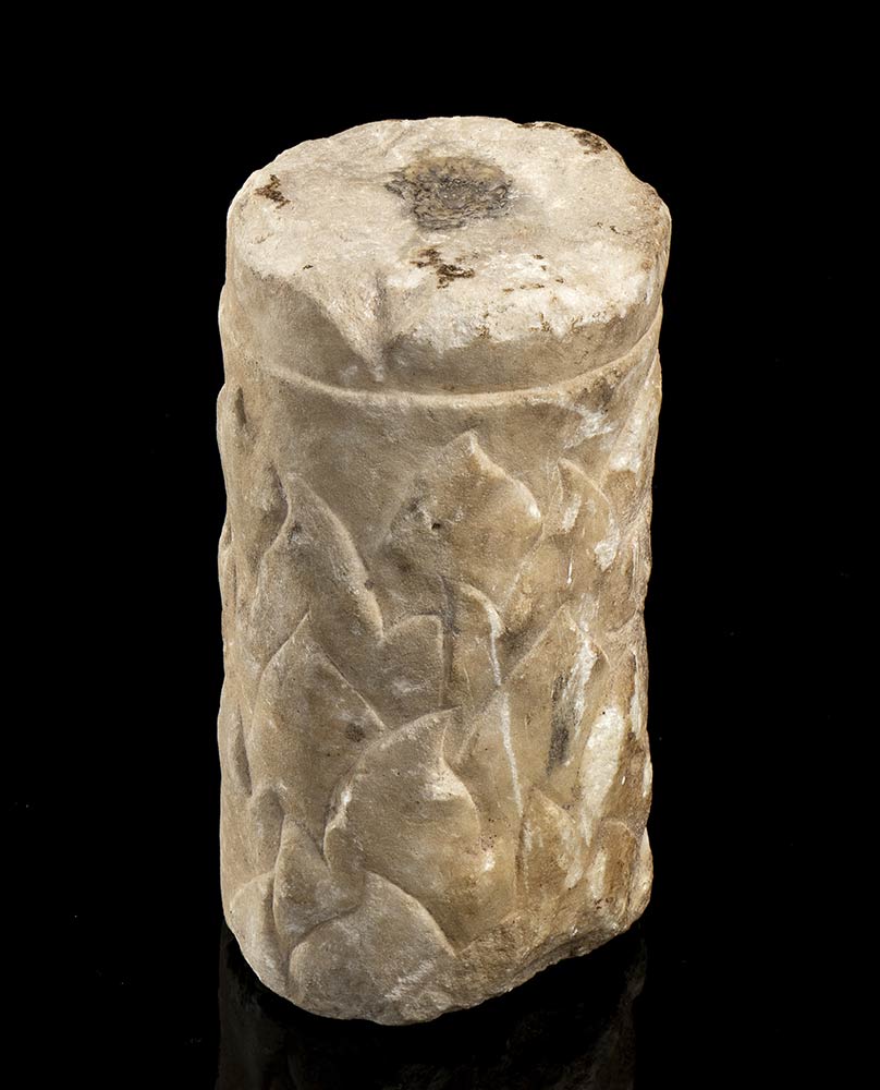II - IV secolo d.C.; alt. cm 15; diam. cm 8,5; Splendida e compatta colonnina in marmo lunense, con teoria di foglie d’edera. Bella patina di vecchia di collezione. Graffi sparsi e foro centrale passante; utilizzata come porta candele in tempi recenti.