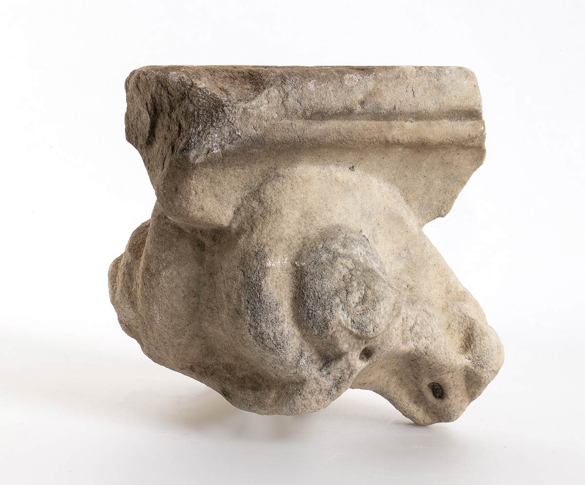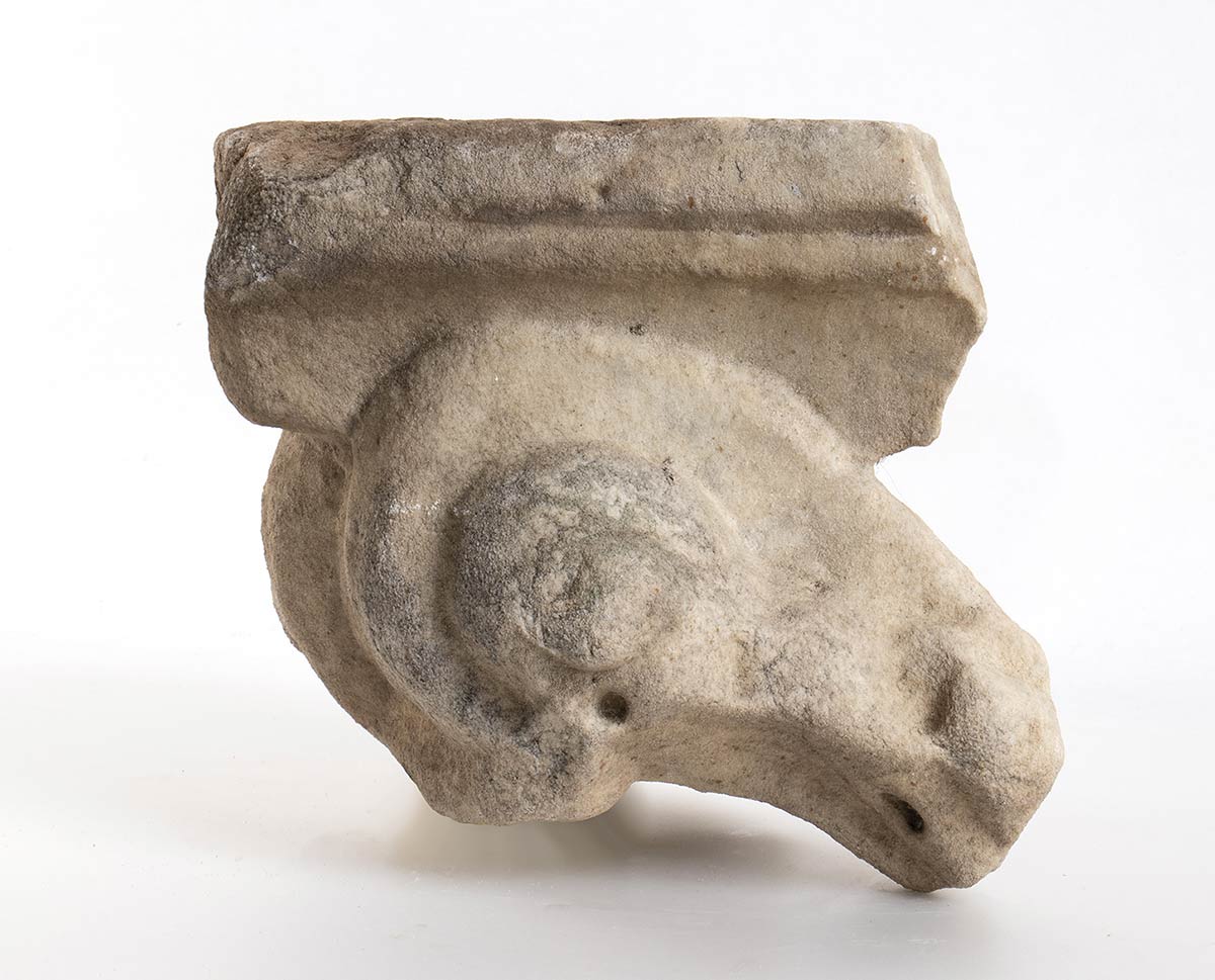 II - III secolo d.C.; alt cm 20; largh. cm 18; Angolare di grande capitello corinzio in marmo lunense, con due terminali a volute di foglie d’acanto conservate. Superficie lievemente farinosa; tracce di scialbatura.