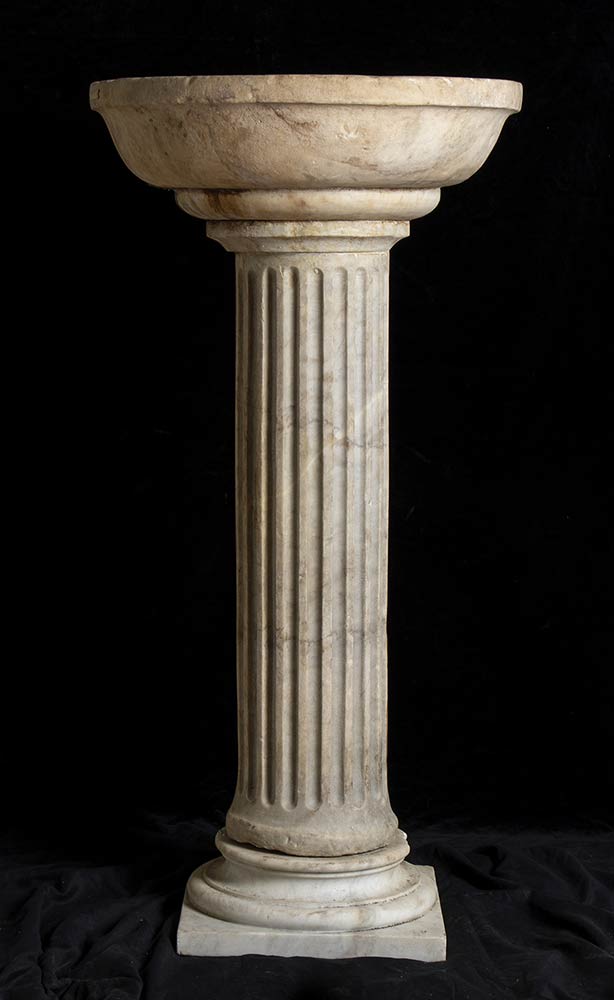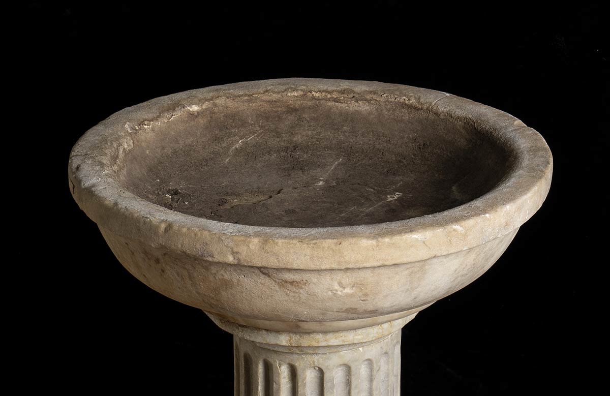 Epoca romana; colonna alta cm 79,5; bacino diam. esterno cm 56; alt. totale cm 113; Pastiche realizzato unendo vari elementi marmorei di epoca romana; solamente la base è di epoca moderna. Su di un fianco del bacino è una crepa piombata in antico.