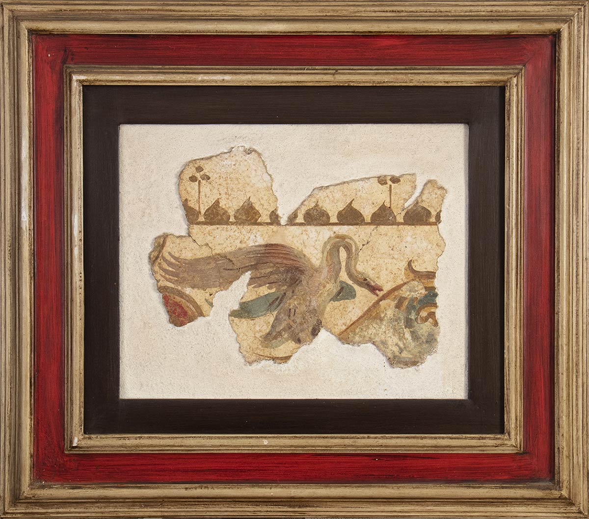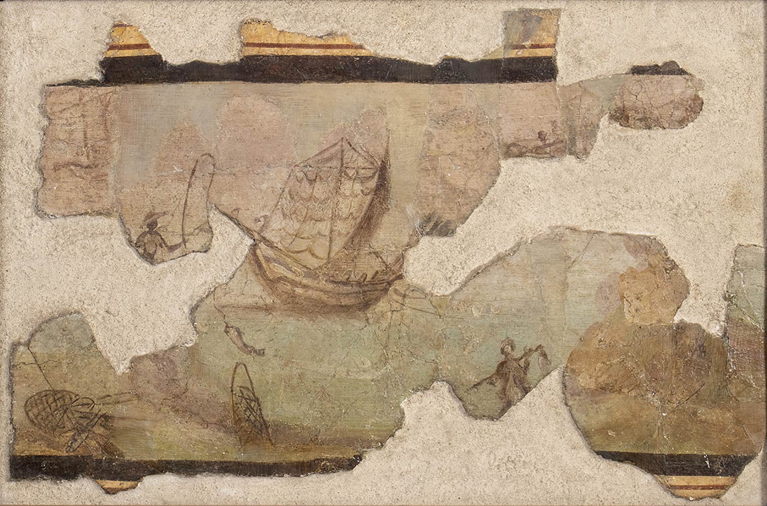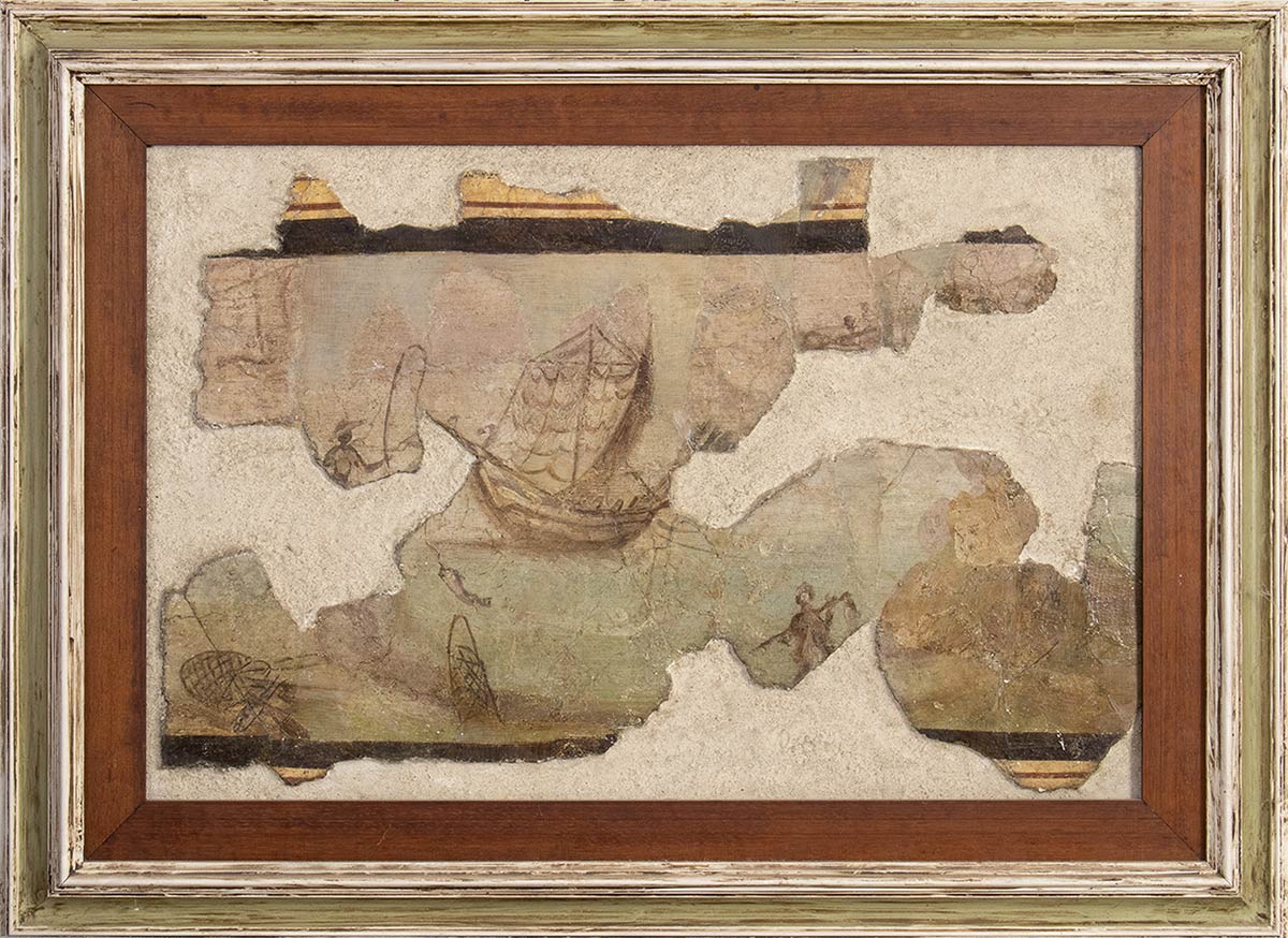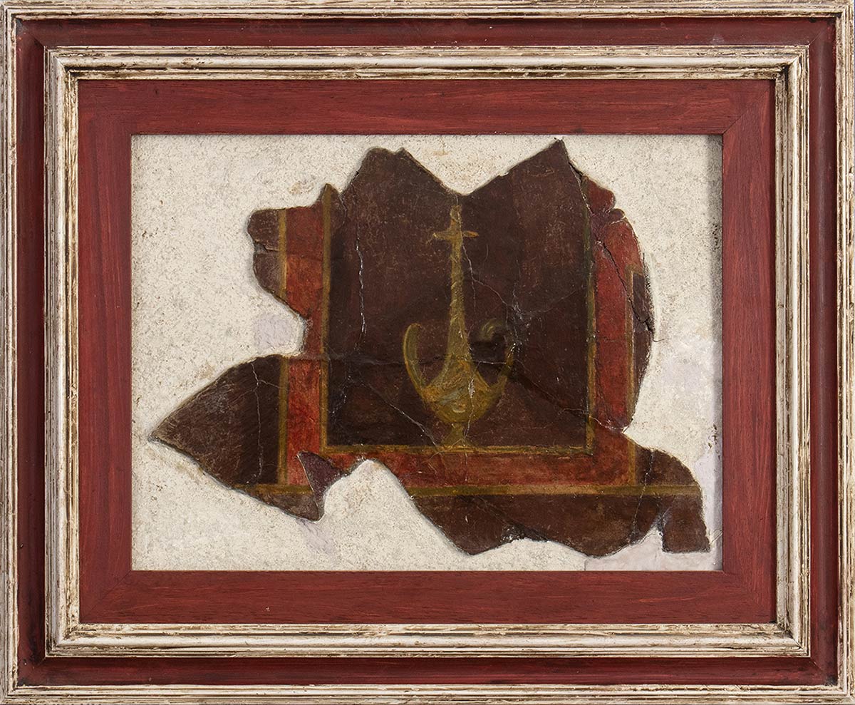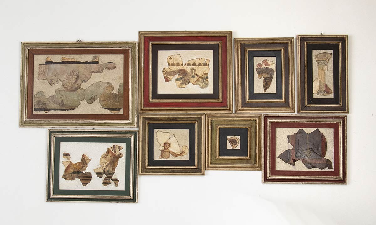 I secolo a.C. - I secolo d.C.; ; Bellissima raccolta di otto affreschi, prevalentemente di età giulio-claudia, elegantemente montati su altrettante cornici in legno dipinto. I vari soggetti conservati rappresentano i resti di pareti riccamente dipinte in secondo e in terzo stile pompeiano. Spicca per fascino e rarità un quadretto quasi completo (cm 53 x 32) mostrante una baia rocciosa che si apre al mare, con un'imbarcazione centrale circondata da pescatori e reti da pesca. Vi sono poi: un trofeo di armi e scudi (cm 13 + 17,5 x 23); un candelabro bronzeo su fondo rosso (cm 30 x 23); una colonna in stile composito pertinente ad una quinta scenografica (cm. 25 x 12); un volto maschile espressivo (cm 20 x 12); la testa frontale di Medusa (cm 8 x 7,5); un personaggio maschile togato e laureato (cm 17 x 17,5); infine un raffinato cigno in volo (cm 27 x 20).
