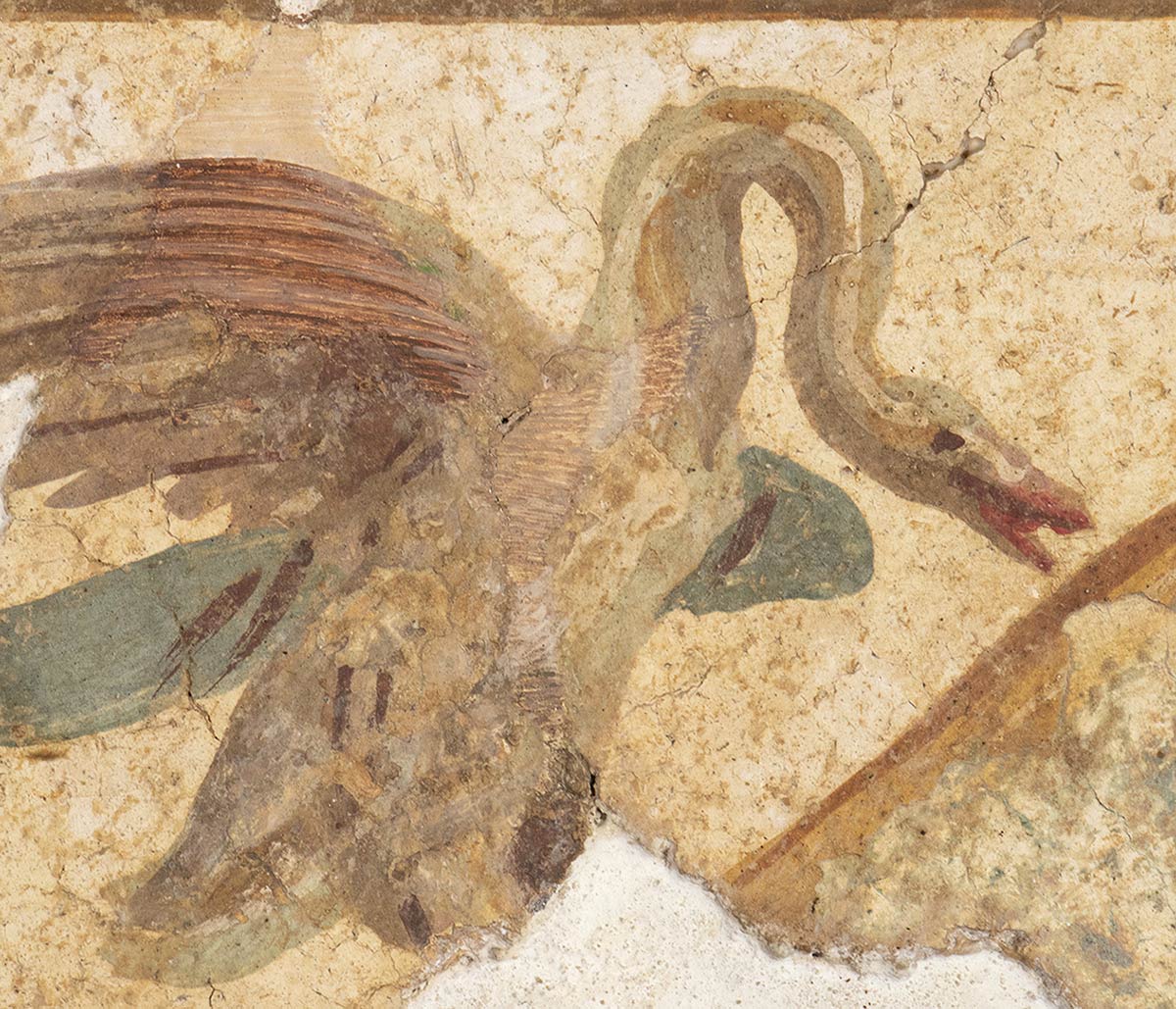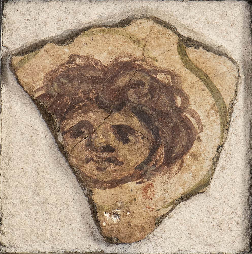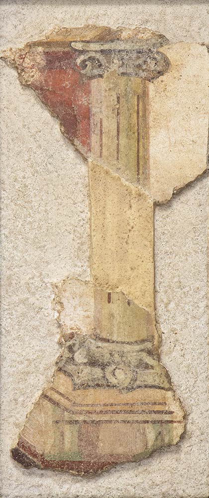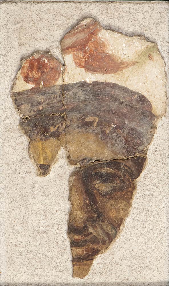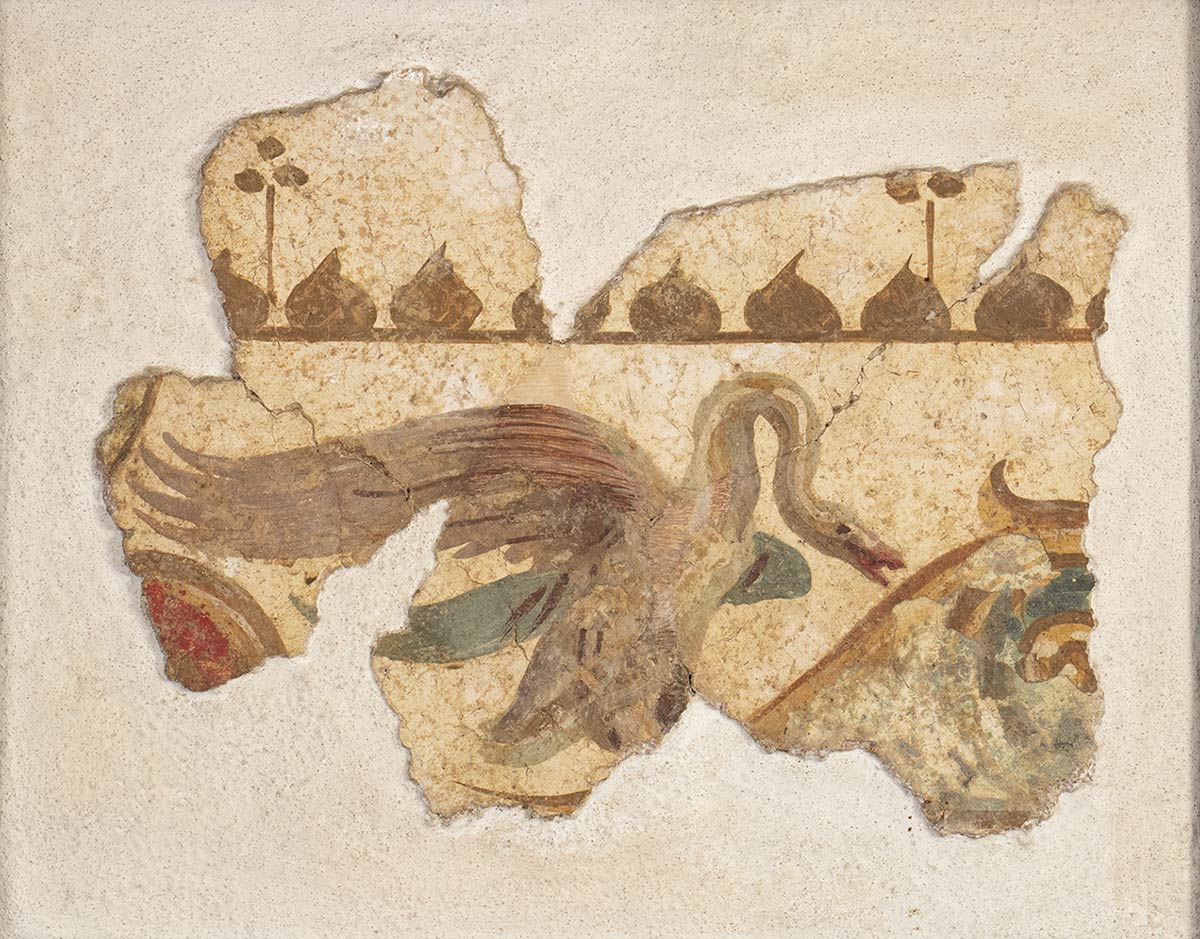 I secolo a.C. - I secolo d.C.; ; Bellissima raccolta di otto affreschi, prevalentemente di età giulio-claudia, elegantemente montati su altrettante cornici in legno dipinto. I vari soggetti conservati rappresentano i resti di pareti riccamente dipinte in secondo e in terzo stile pompeiano. Spicca per fascino e rarità un quadretto quasi completo (cm 53 x 32) mostrante una baia rocciosa che si apre al mare, con un'imbarcazione centrale circondata da pescatori e reti da pesca. Vi sono poi: un trofeo di armi e scudi (cm 13 + 17,5 x 23); un candelabro bronzeo su fondo rosso (cm 30 x 23); una colonna in stile composito pertinente ad una quinta scenografica (cm. 25 x 12); un volto maschile espressivo (cm 20 x 12); la testa frontale di Medusa (cm 8 x 7,5); un personaggio maschile togato e laureato (cm 17 x 17,5); infine un raffinato cigno in volo (cm 27 x 20).