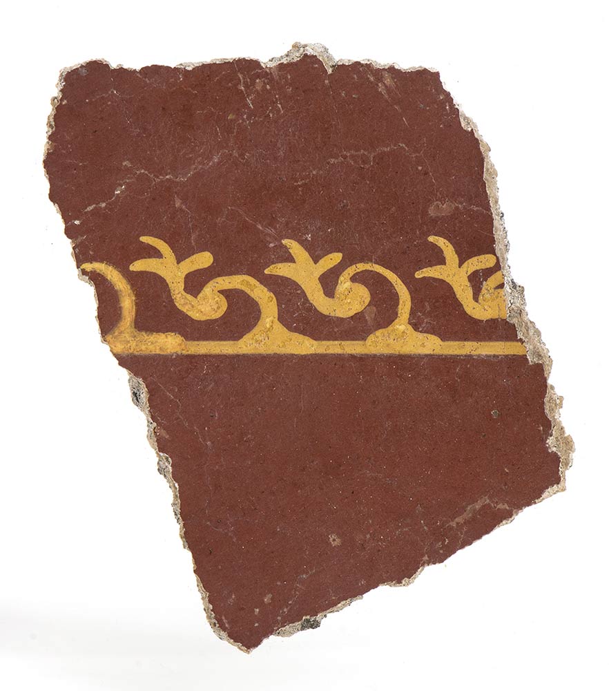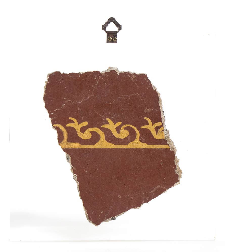 I - II secolo d.C.; alt. cm 12; largh. cm 11; plexiglass cm 16 x 16; Frammento di affresco di epoca romana con cornicetta gialla su fondo rosso pompeiano.