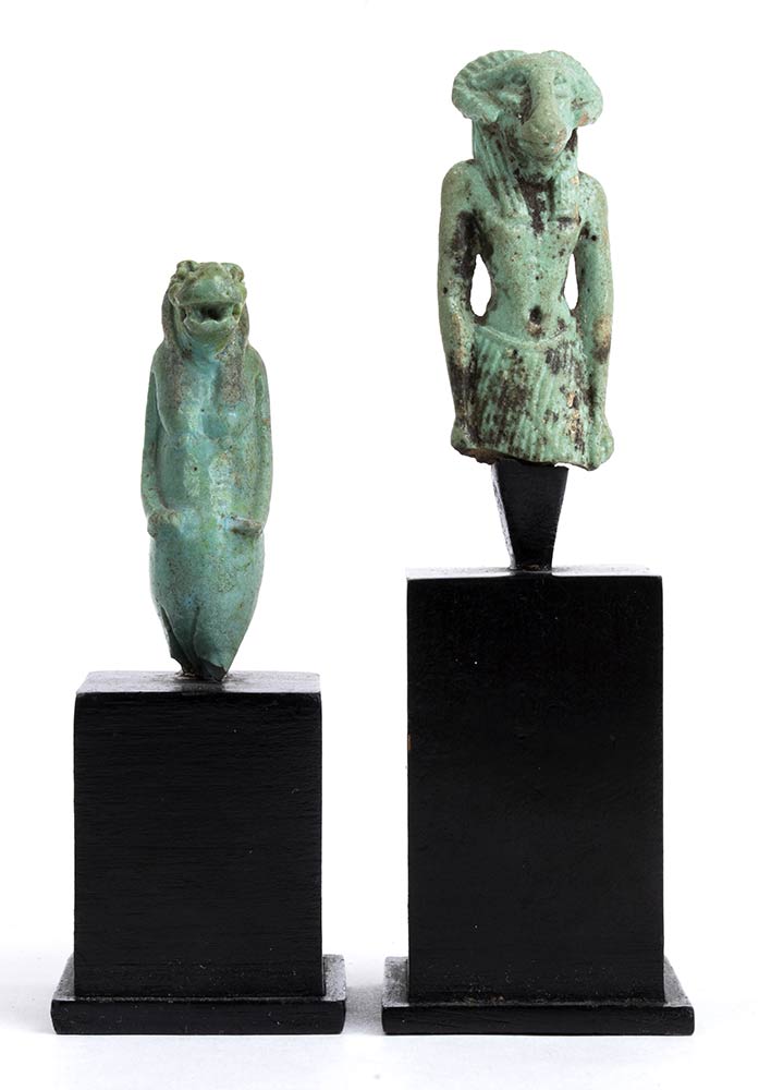 COPPIA DI AMULETI EGIZI IN FAIENCE: KHNOUM E THOUERIS