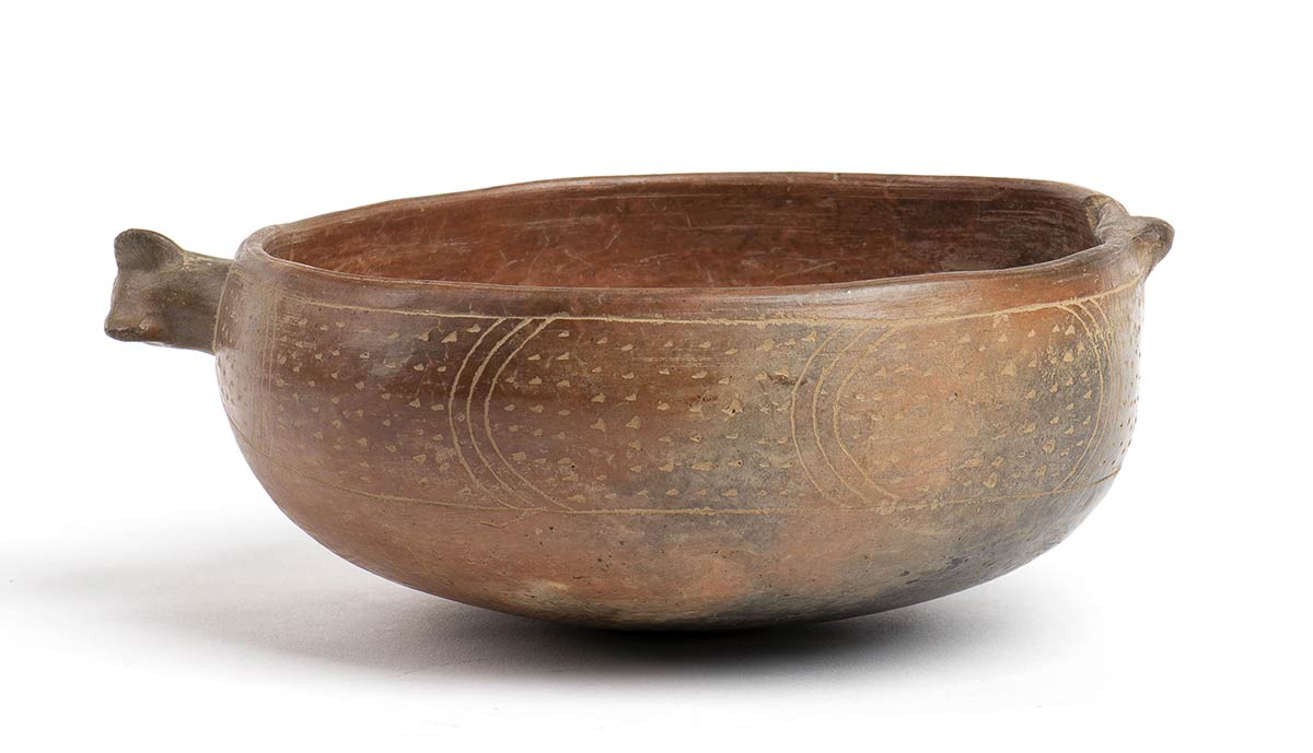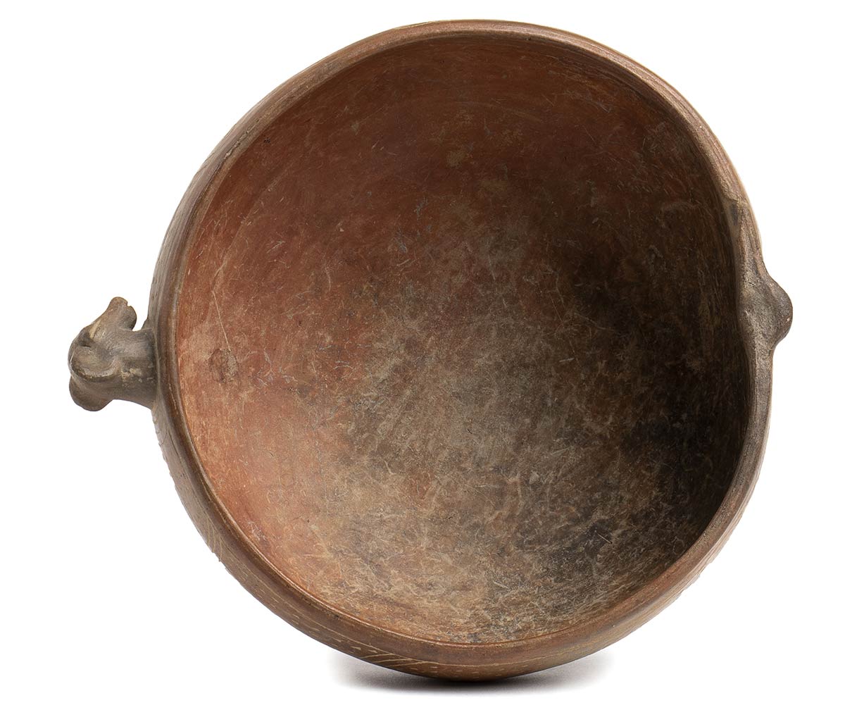 Cultura Bahia, dal V secolo a.C. fino al V secolo d.C.; diam. cm 16; alt. cm 7; Sul corpo è inciso un giaguaro che gira sulla circonferenza della ciotola per poi uscirne fuori con la testa a rilievo. Una minima scheggiatura sull’interno del labbro.