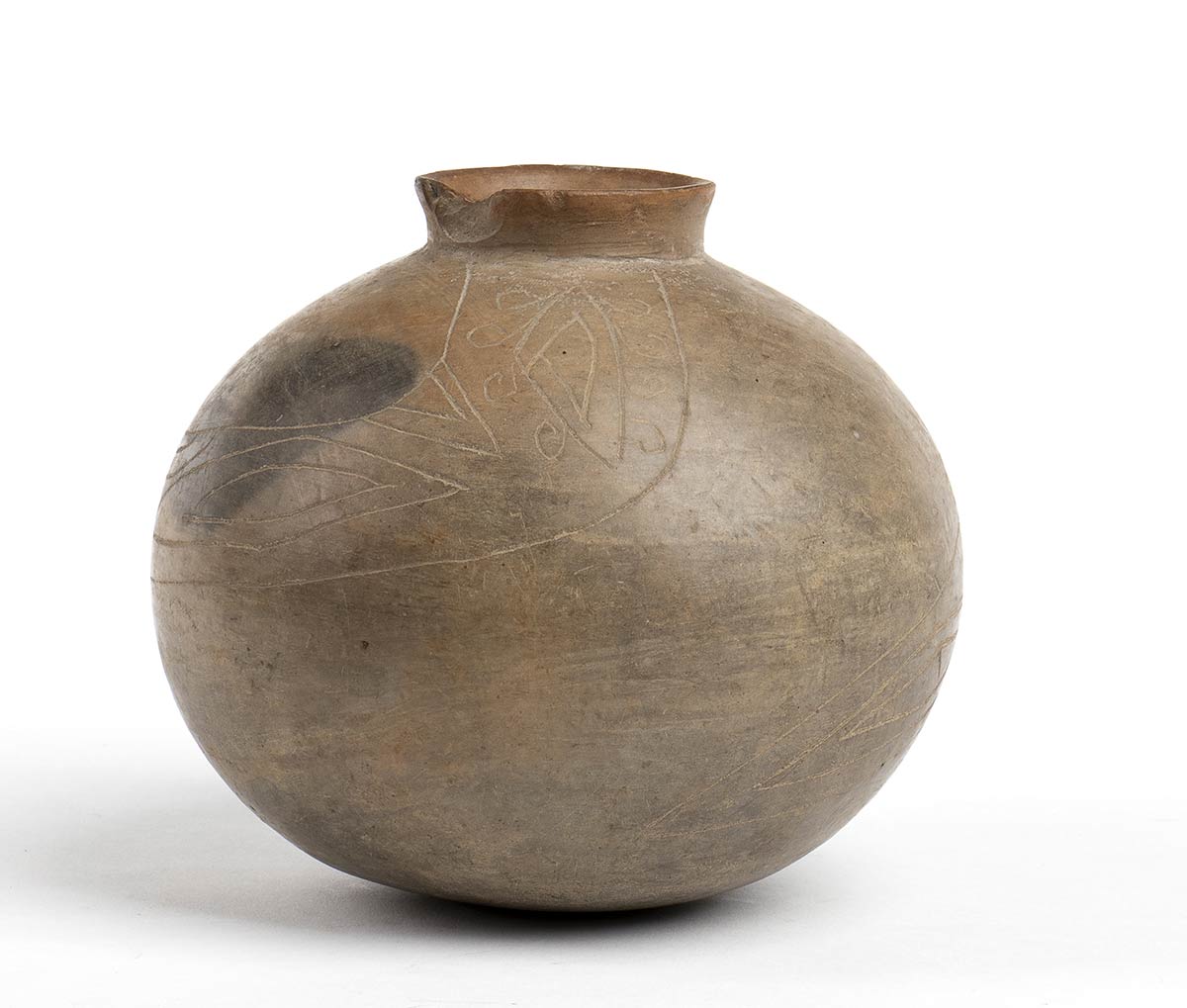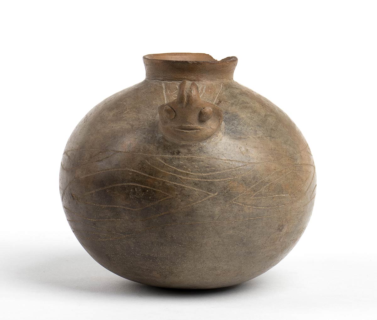 Cultura Bahia, dal V secolo a.C. fino al V secolo d.C.; alt. cm 13; Sul corpo è inciso un serpente che gira sulla circonferenza dell’olla per poi uscirne fuori con la testa a rilievo. Una scheggiatura sul labbro e una sulla testa del serpente.