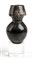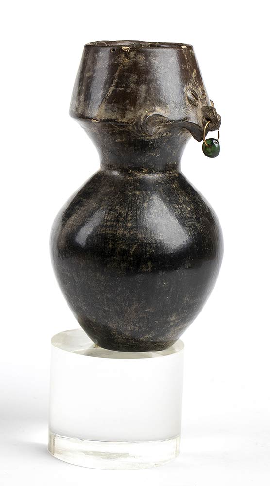 Cultura Tairona, XI - XV secolo; alt. cm 16; L’intera superficie, sia interna che esterna, è rivestita di un ingobbio marrone scuro brillante e lucente ottenuto da una pittura ricca di ferro. Il vaso riproduce in maniera fortemente stilizzata un individuo, come si evince dalle orecchie, dagli occhi e dal naso, sul quale è agganciato un anellino in oro con pendente in giada. Restauri sull’intero orlo. Provvisto di base cilindrica in plexiglass.