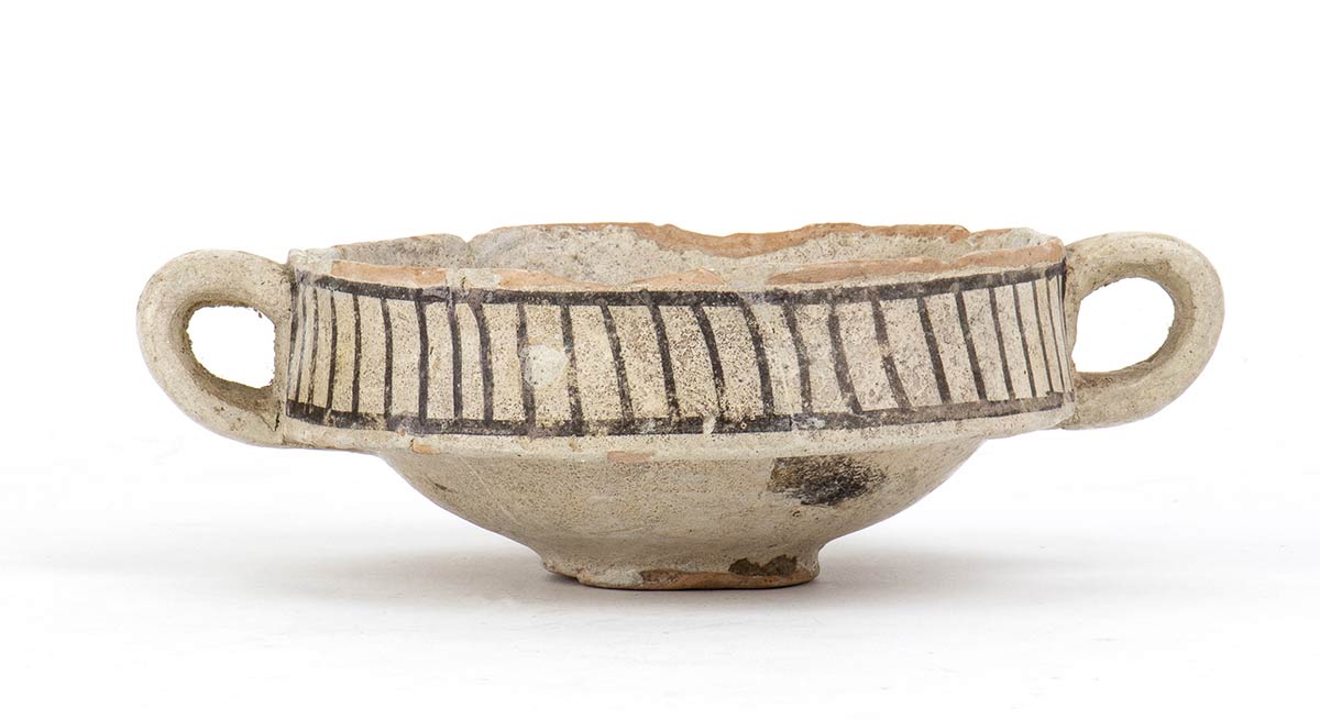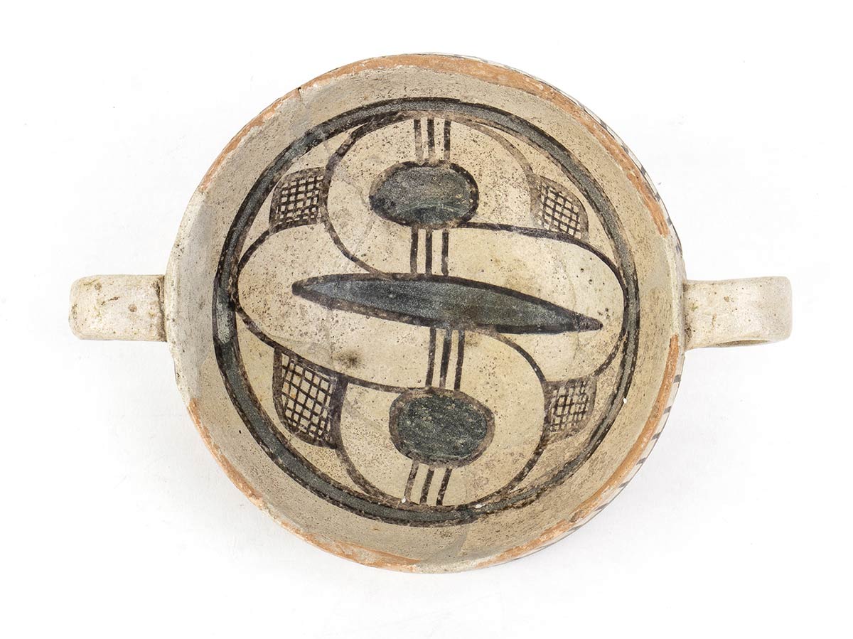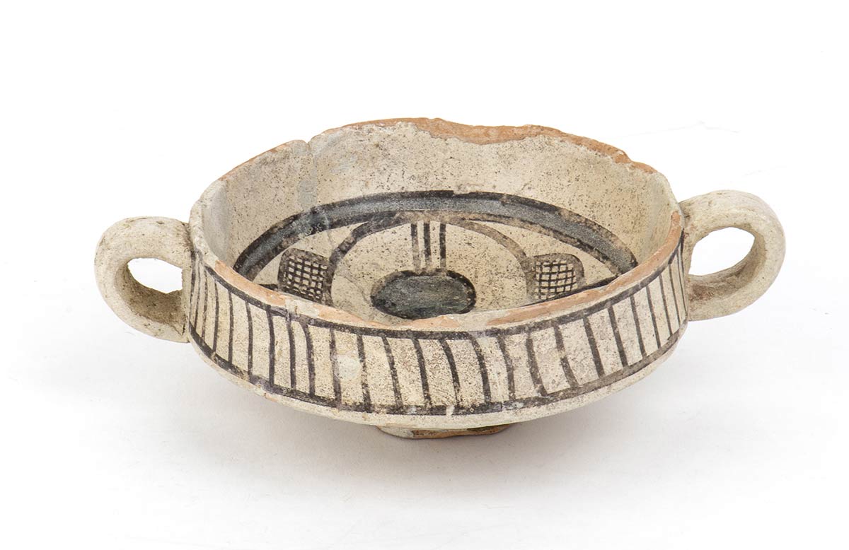 Lazio, XIV secolo; alt cm. 5; diam. vasca cm 11,5; Nodi su fondo a graticcio. Bel restauro integrativo, minime ricostruzioni.