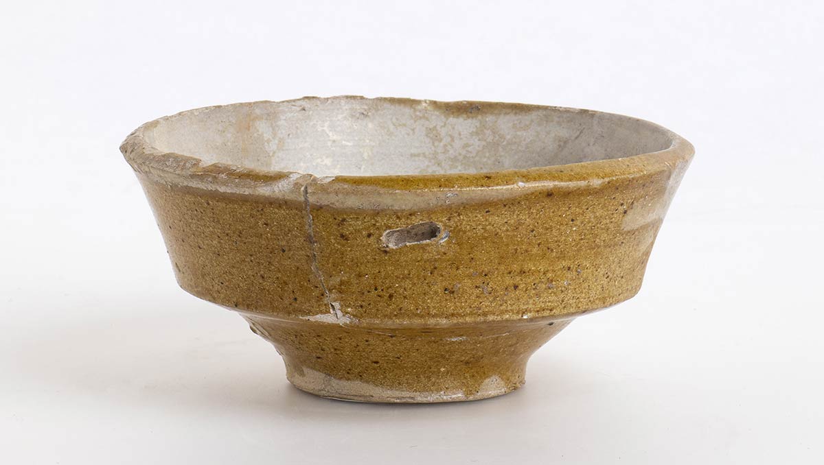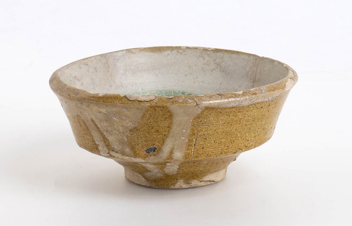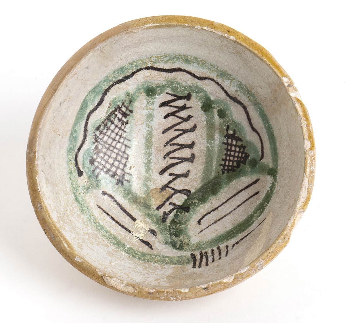 Lazio, XIV secolo; alt cm. 5,5; diam. cm 13; Motivo fogliato stilizzato centrale con graticcio. Bel restauro integrativo, una piccola parte di orlo ricostruita.