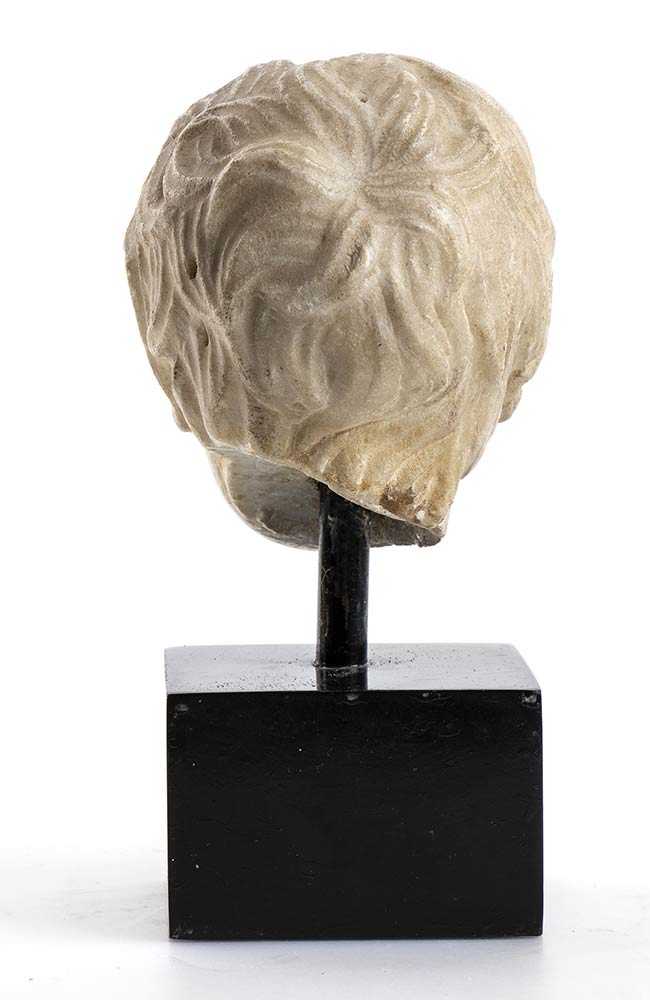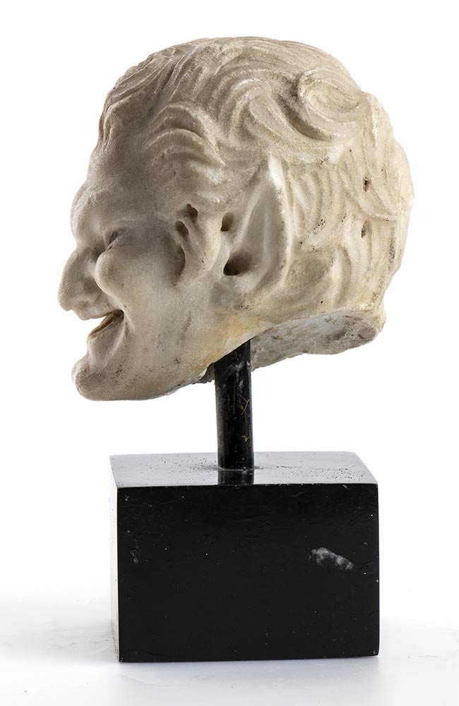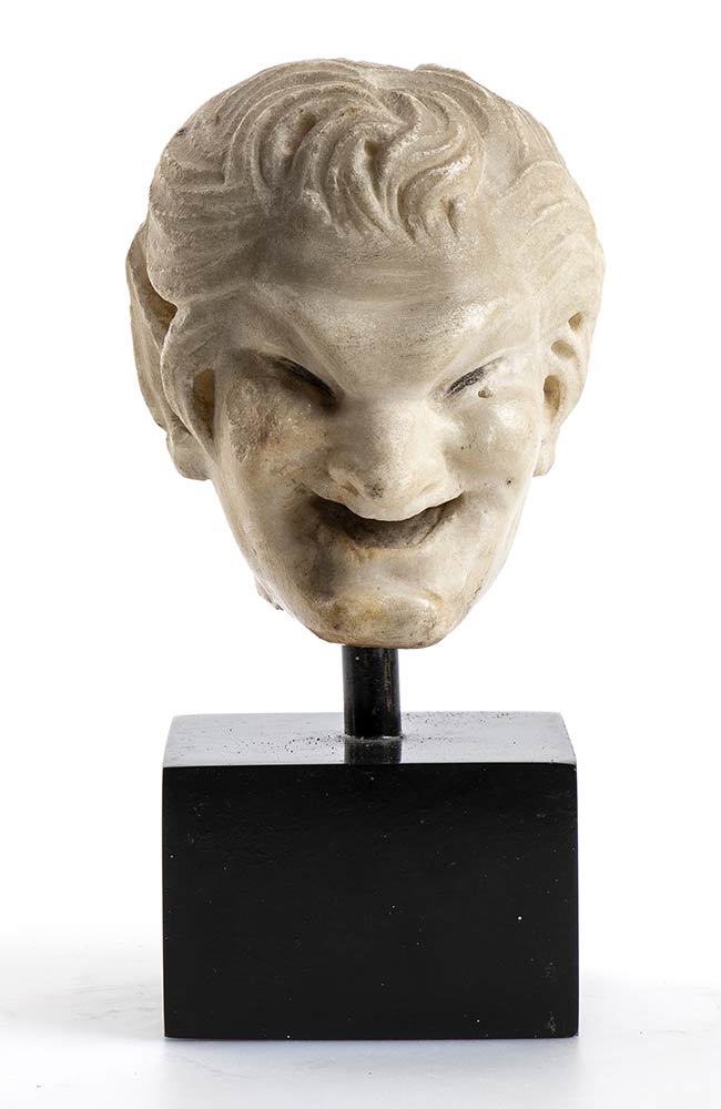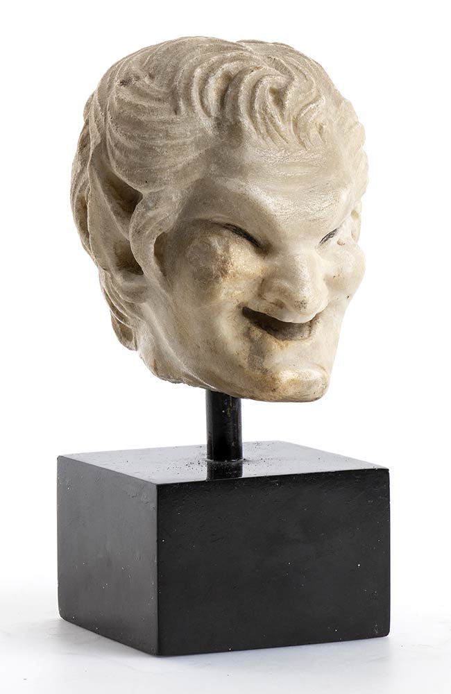 XVII - XVIII secolo; alt. cm 9; alt. totale con base cm 15,5; Piccola scultura grottesca: ritratto marmoreo di un Satiro dall'espressione beffarda. Tracce di vecchia patina alla base del collo.