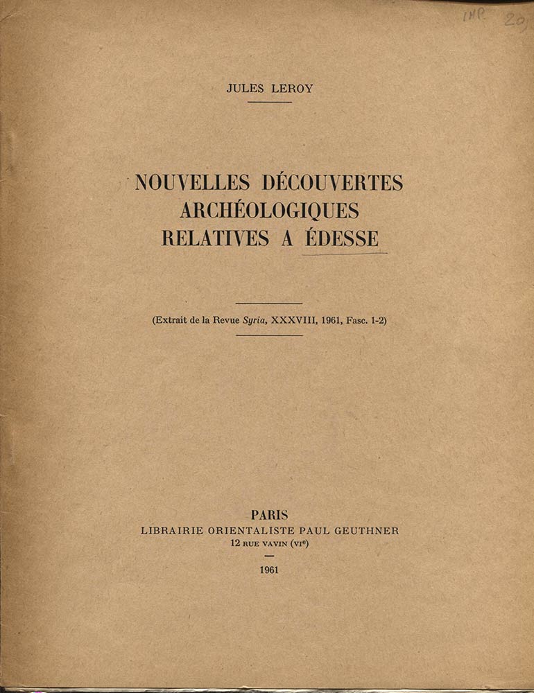LERON J. – Nouvelles decouvertes archeologiques relatives a Edesse. Paris, 1961. Pp. 159, - 169, ill. nel testo. ril ed. buono stato.