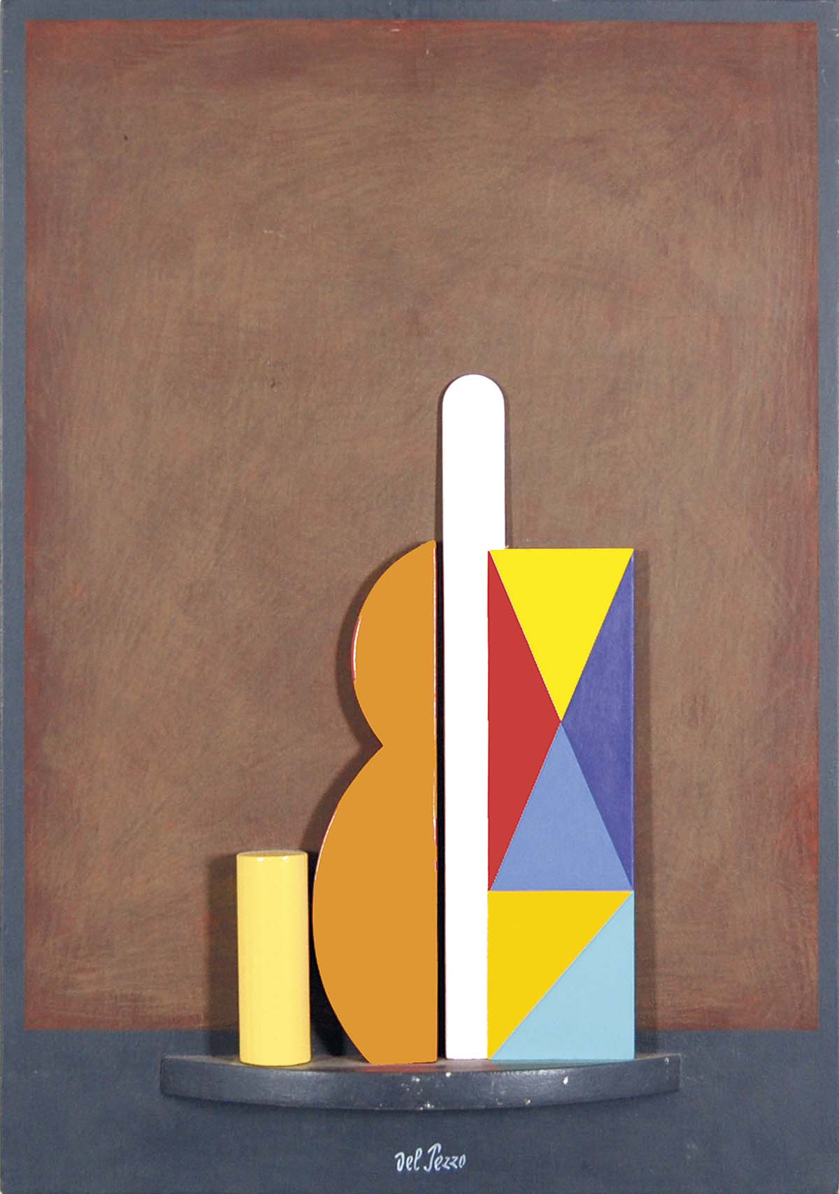 DEL PEZZO LUCIO Napoli 1933 Mensola policroma acrilici e collage su legno 50x35 cm firma e titolo al retro