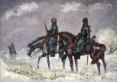 Giovan Francesco GONZAGA Milano 1921 - Milano 2007 Pattuglia di Savoia nella steppa, 1982 Olio su tela cm 70 X 100 Autentica dell’Archivio Gonzaga su fotografia Firma ‘G.F. Gonzaga’ (in basso a destra) Firma, data, titolo ‘G.F. Gonzaga, 1982, studio di Milano, Pattuglia di Savoia nella steppa, fronte russo 1946-42’; timbro dell’Archivio Gonzaga (al retro)
