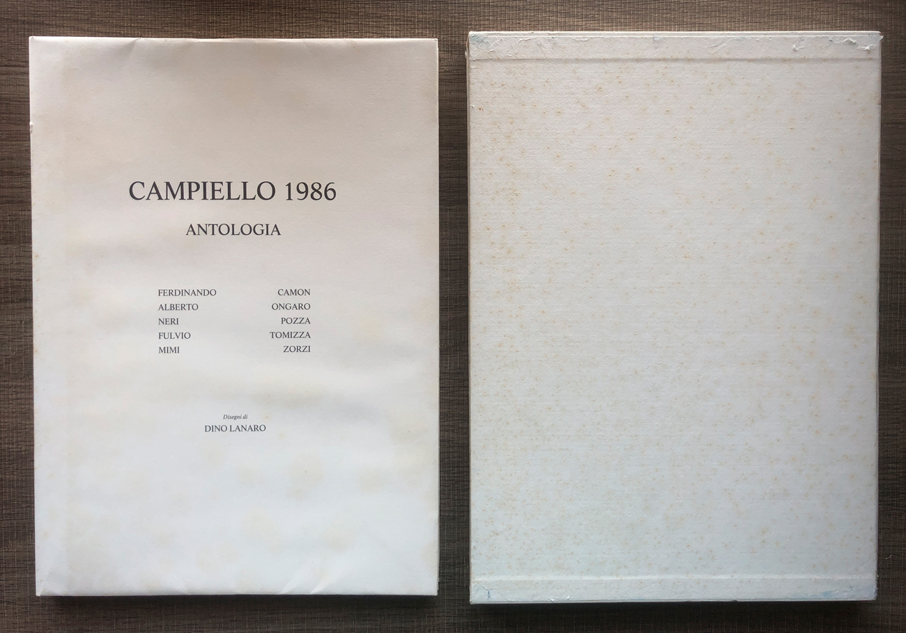 Volume contenente 5 fotolitografie di Dino Lanaro, ciascuna recante firma in lastra, e un'antologia di testi di Ferdinando Camon, Alberto Ongaro, Neri Pozza, Fulvio Tomizza e Mimi Zorzi