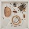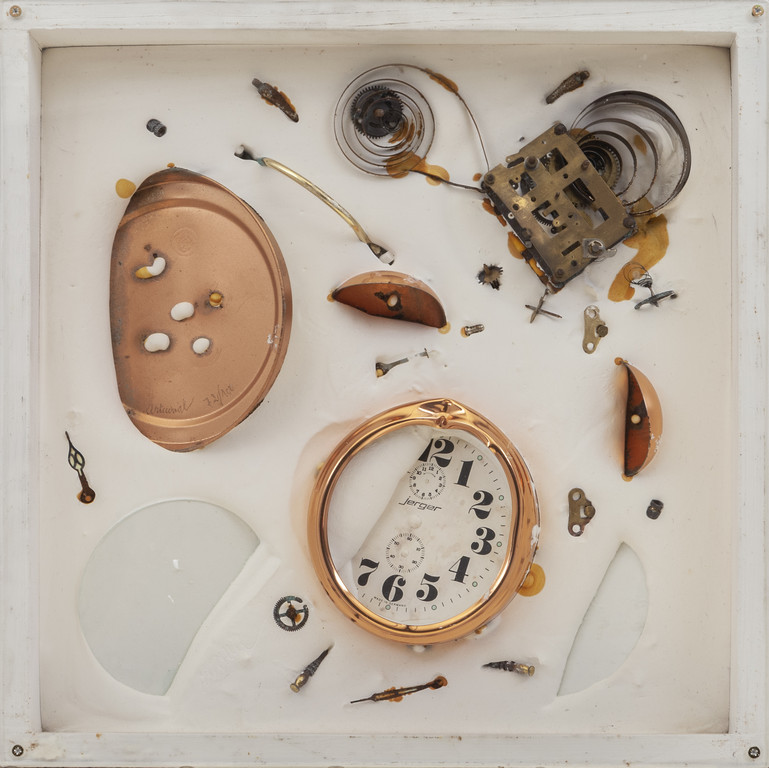 inclusion in plaster of a shattered alarm clock in a wooden box 13 77x13 77x3 54