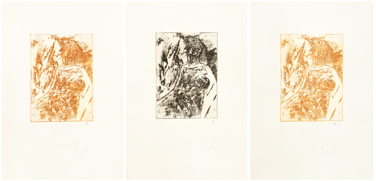 Firma e numerazione (Esemplari 110/149, 107/149 e 121/149) a matita al fronte di ciascuna opera grafica