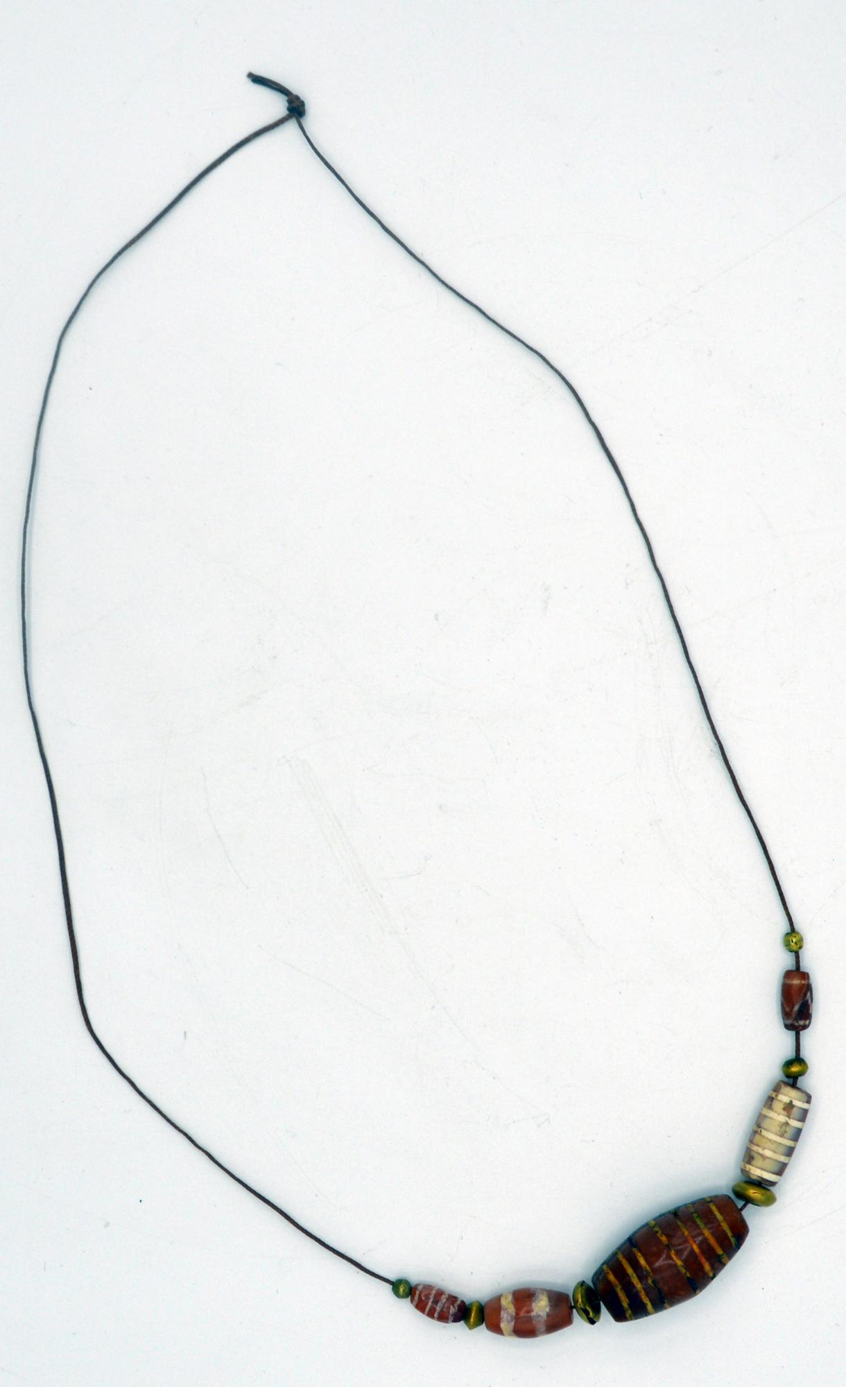 Collana di cinque vaghi prismatici in corniola decorati in bianco con l'uso di acidi, alternati ad elementi aurei lenticolari.