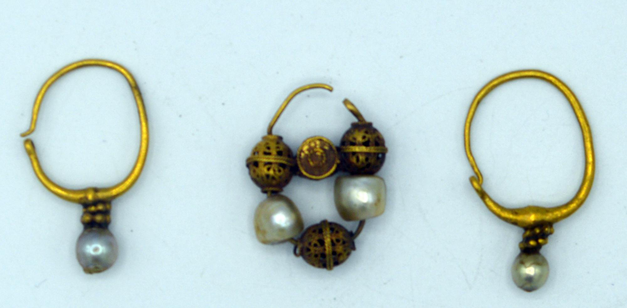 Coppia di orecchini in filo d'oro, ingrossato nella parte inferiore con una perla pendente ed un collarino a granulazione; un orecchino in filo d'oro con tre perle in oro lavorate a traforo e granulazione, alternate a due perle. (3)