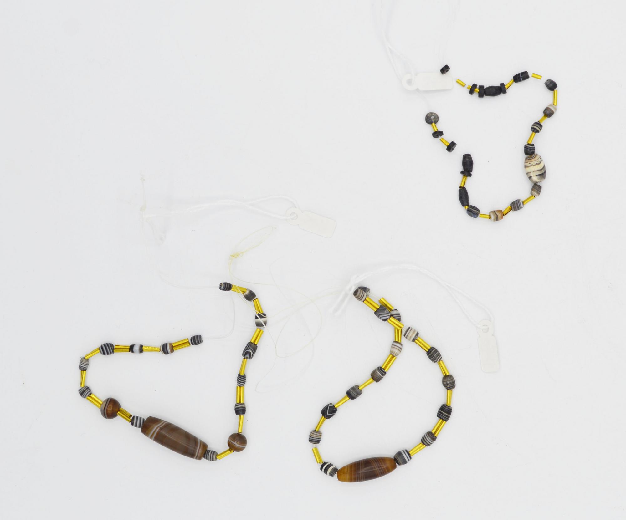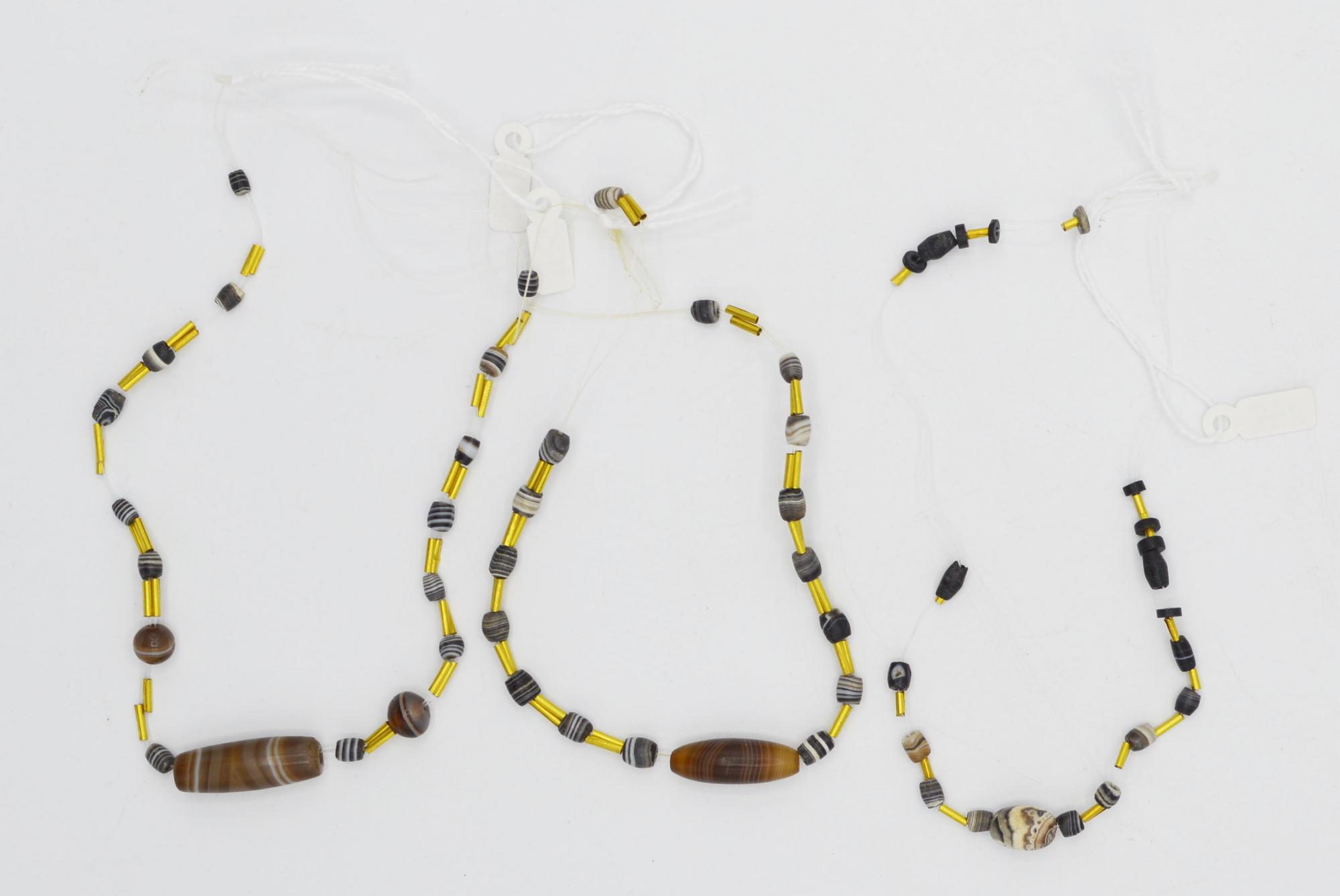 Collana a tre fili composta da vaghi tubolari in oro che si alternano a vaghi ellittici in agata, con elemento centrale fusiforme in agata di maggiori dimensioni.